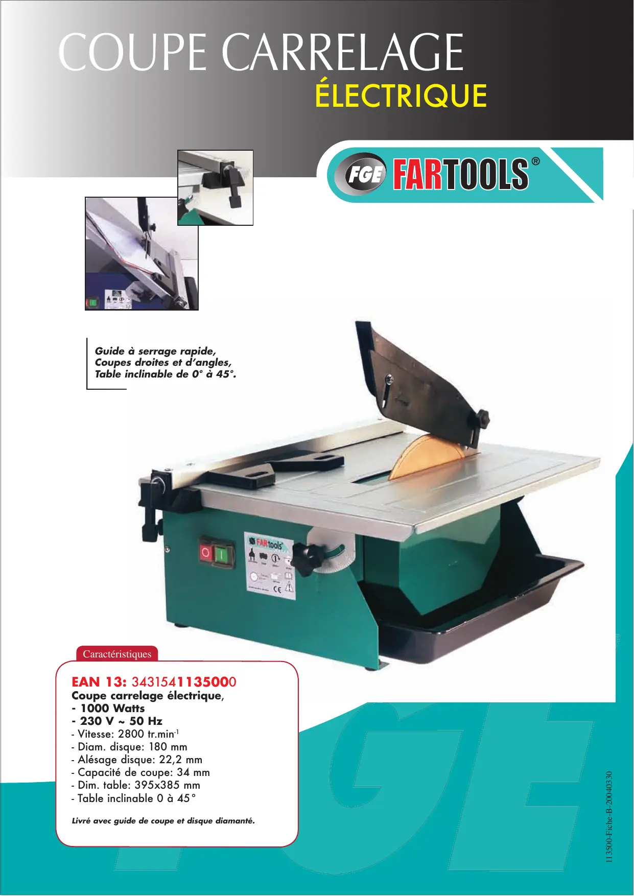 ÉLECTRIQUE Guide à serrage rapide, Coupes droites et d’angles, Table inclinable de 0° à 45°. Caractéristiques Coupe carrelage électrique, - 1000 Watts - 230 V ~ 50 Hz - Vitesse: 2800 tr.min-1 - Diam. disque: 180 mm - Alésage disque: 22,2 mm - Capacité de coupe: 34 mm - Dim. table: 395x385 mm - Table inclinable 0 à 45° Livré avec guide de coupe et disque diamanté. 113500-Fiche-B-20040330 EAN 13: 3431541135000