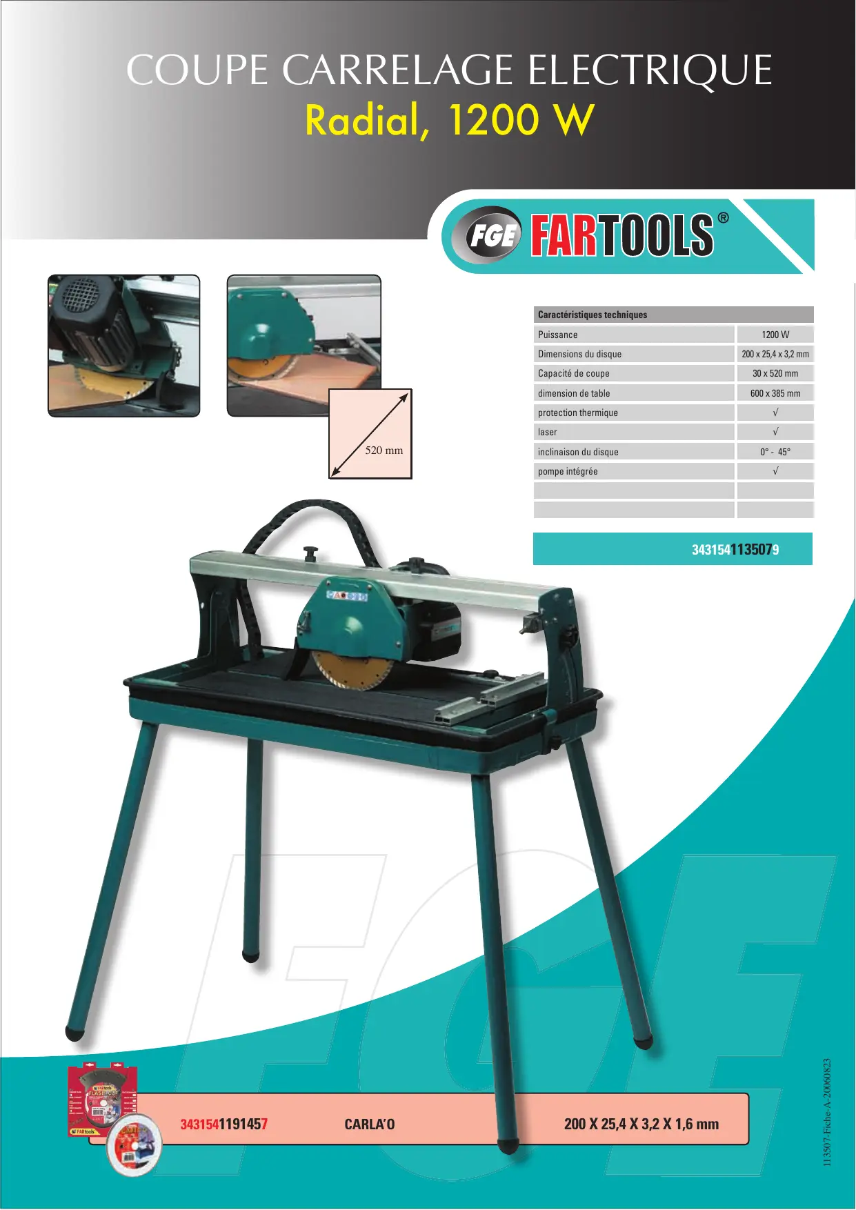 Radial, 1200 W Caractéristiques techniques Puissance 1200 W Dimensions du disque 30 x 520 mm dimension de table 600 x 385 mm protection thermique