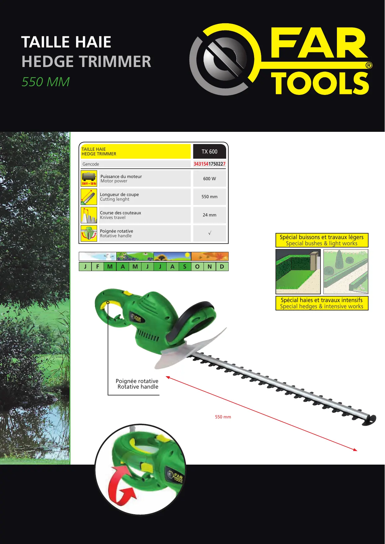 Gencode Puissance du moteur Motor power 600 W Longueur de coupe Cutting lenght 550 mm Course des couteaux Knives travel 24 mm Poignée rotative Rotative handle