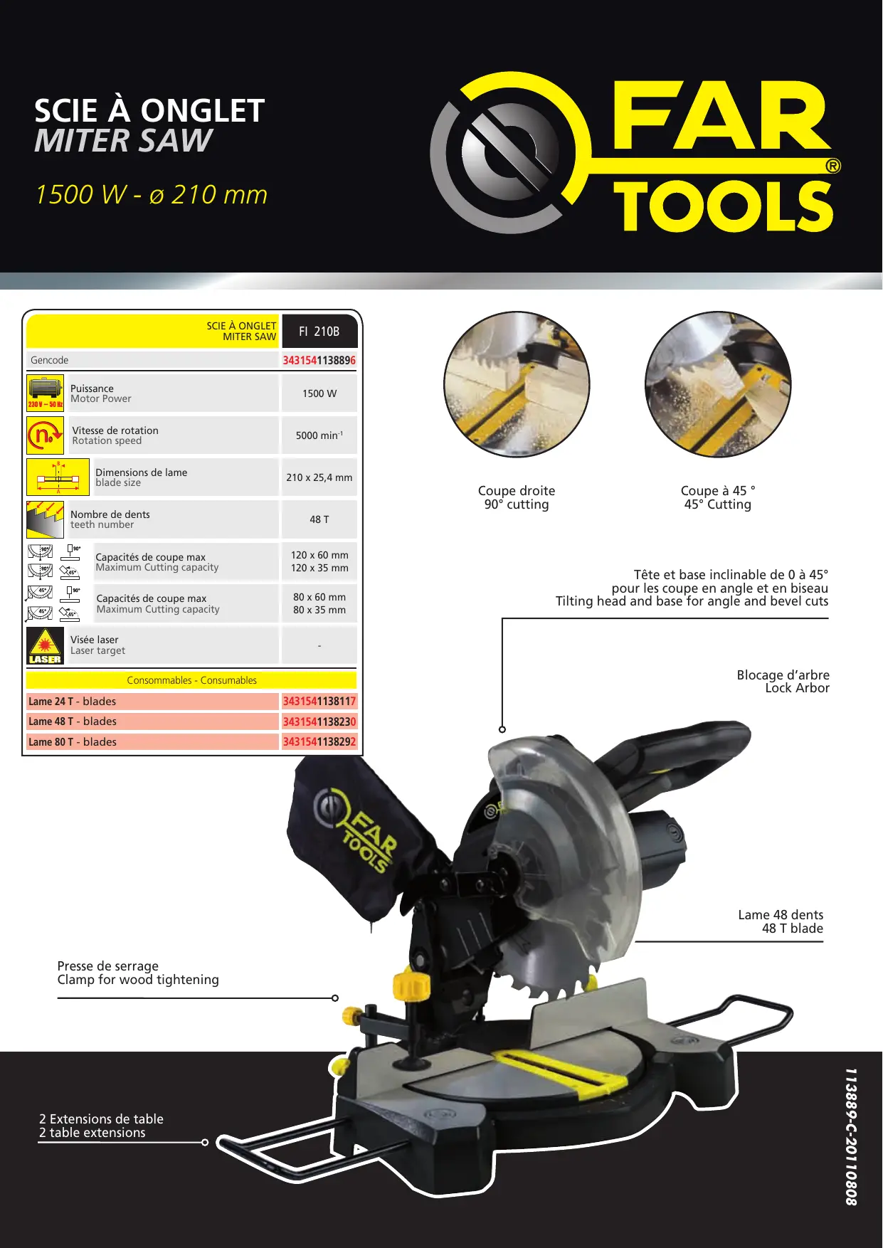 Dimensions de lame blade size Nombre de dents teeth number LASER FI 210B 1500 W 5000 min-1 210 x 25,4 mm Coupe à 45 ° 45° Cutting 48 T Capacités de coupe max Maximum Cutting capacity 120 x 60 mm 120 x 35 mm Capacités de coupe max Maximum Cutting capacity 80 x 60 mm 80 x 35 mm Visée laser Laser target Coupe droite 90° cutting Tête et base inclinable de 0 à 45° pour les coupe en angle et en biseau Tilting head and base for angle and bevel cuts Consommables - Consumables Lame 24 T - blades