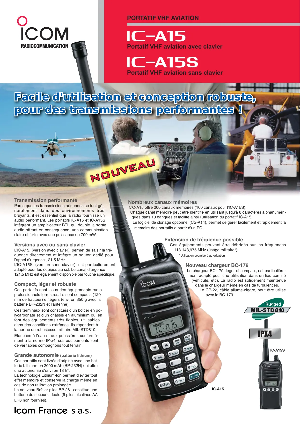 Versions avec ou sans clavier L’IC-A15, (version avec clavier), permet de saisir la fréf quence directement et intègre un bouton dédié pour l’appel d’urgence 121,5 MHz. L’IC-A15S, (version sans clavier), est particulièrement adapté pour les équipes au sol. Le canal d’urgence 121,5 MHz est également disponible par touche spécifique.