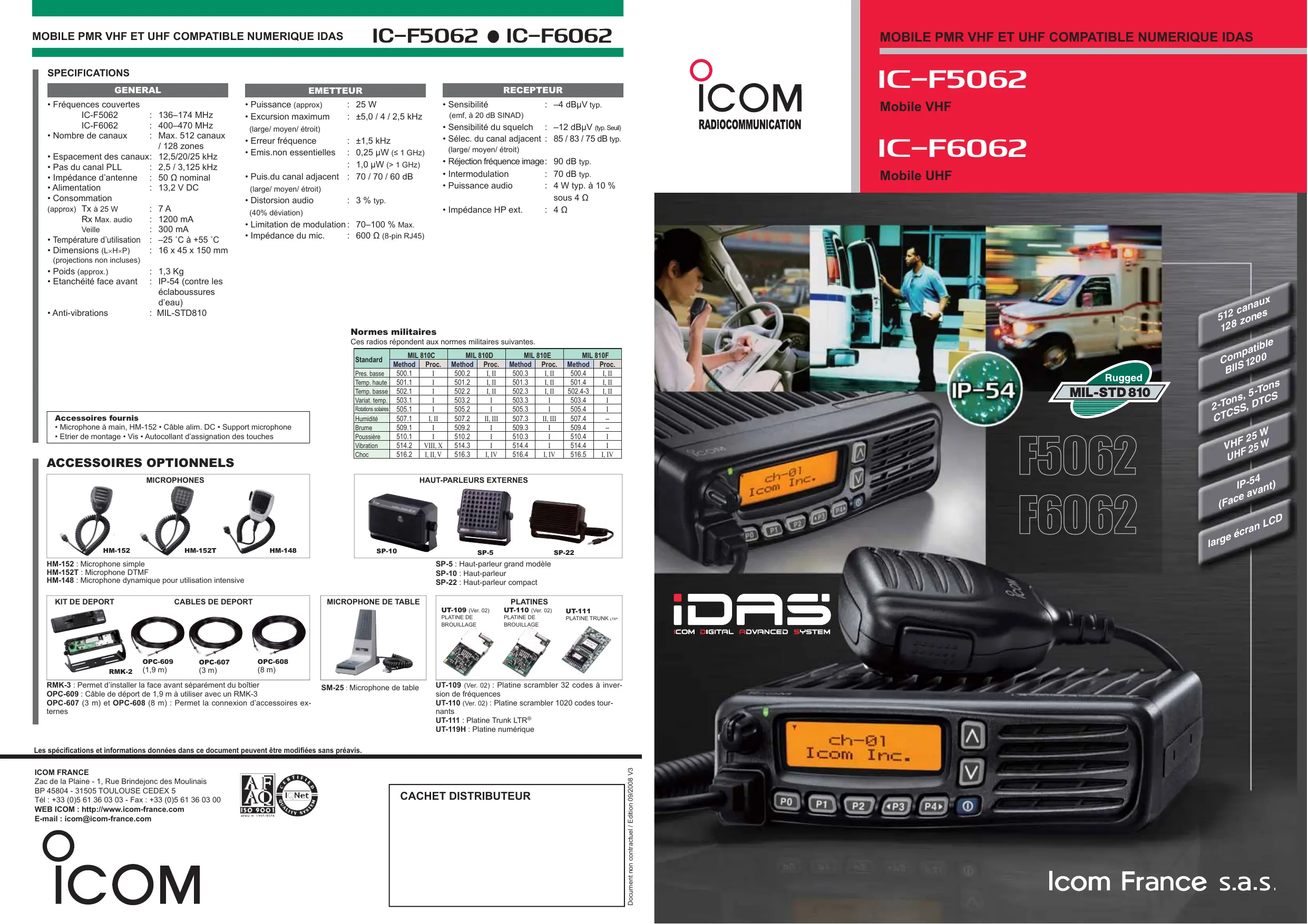 Tél : +33 (0)5 61 36 03 03 - Fax : +33 (0)5 61 36 03 00 WEB ICOM : http://www.icom-france.com E-mail : icom@icom-france.com CACHET DISTRIBUTEUR Document non contractuel / Edition 09/2008 V3 Les spécifications et informations données dans ce document peuvent être modifiées sans préavis.