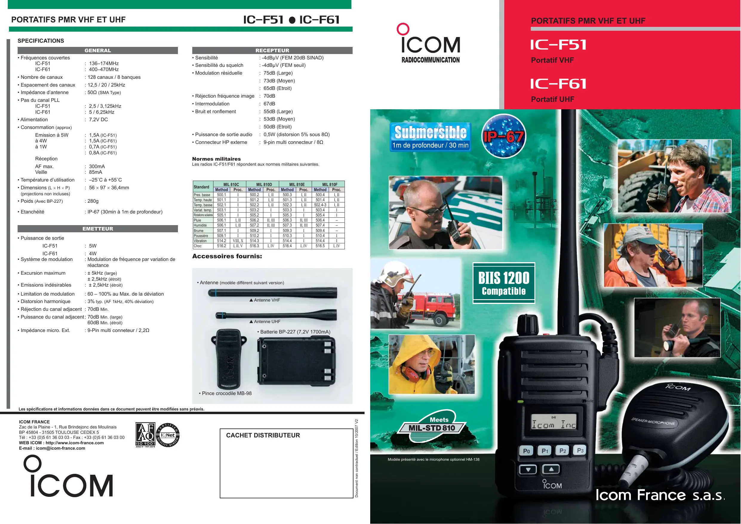 Tél : +33 (0)5 61 36 03 03 - Fax : +33 (0)5 61 36 03 00 WEB ICOM : http://www.icom-france.com E-mail : icom@icom-france.com CACHET DISTRIBUTEUR Document non contractuel / Edition 10/2007 V2 Les spécifications et informations données dans ce document peuvent être modifiées sans préavis. Modèle présenté avec le microphone optionnel HM-138 Robuste et 100% étanche ! Communications de qualité ! Services de police, Sécurité publique, BTP, Activités sportives, tous les métiers à risques ont le même impératif : assurer la fiabilité des communications quelles que soient les conditions atmosphériques. Les portatifs de la série IC-F51/F61 sont non seulement les plus compacts de leur catégorie mais aussi les seuls à offrir une étanchéité parfaite aux poussières et liquides (IP-67) et être compatibles d’origine à la norme BIIS 1200. Etanchéité IP-67* Un joint spécial autour du chassis assure l’étanchéité totale de l’appareil. La fiabilité d’utilisation du IC-F51/F61 dans des conditions extrêmes (pluie, neige, changement soudain de température) en fait la radio idéale pour toutes les situations. Signalisation multi tons incorporée : Les fonctionnalités CTCSS, DTCS, 2 tons et 5 Tons sont disponibles en standard et vous permettent de créer vos propres groupes de conversation, ou bien d’être en veille lorsque d’autres groupes communiquent. Vous pouvez aussi bien sûr envoyer des appels sélectifs aux utilisateurs de votre choix ou contrôler un relais à distance. *Submersible pendant 30 mn à 1 m t IC-F51 t IC-F61 Multi 5 tons Jusqu’à 8 codes 5 Tons peuvent être décodés sur un même canal mémorisé. Lorsqu’un appel sélectif programmé est reçu, les paramètres suivants peuvent y être associés pour une meilleure lisibilité : icône "cloche", bip sonore, décodage identité, répondu, transmission automatique, annulation d’urgence, position silence, scanning. Pack batterie Li-ion La batterie Lithium-Ion grande capacité BP-227 (1700mAh) livrée avec le portatif procure une autonomie d’environ 10 heures (cycle Tx / Rx / veille = 5 / 5 / 90). Cette technologie de batterie supprime les inconvénients liés à l’effet mémoire lors de la charge. Ainsi la batterie a une durée de vie nettement supérieure à une batterie classique. 7 touches programmables et bouton rouge d’urgence Les touches "P0" à "P3", "UP" et "DOWN" sont programmables suivant vos besoins. Le bouton rouge situé sur le dessus de l’appareil est généralement assigné aux appels d’urgence. iF51 Portatif VHF iF61 Portatif UHF Compatible nor me BIIS 1200 (signalisation numérique) La norme BIIS1200 permet de disposer des fonctionnalités suivantes en standard :