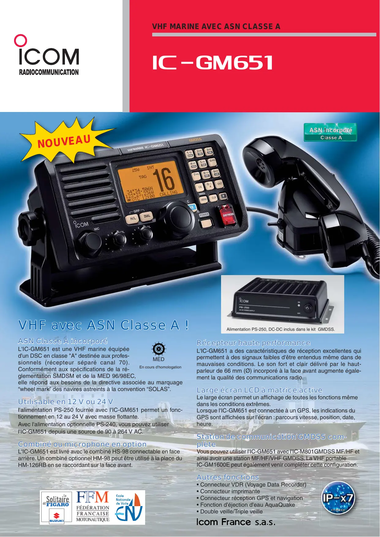 NOUVEAU VHF avec ASN Classe A ! ASN Classe A incorporé L'IC-GM651 est une VHF marine équipée d'un DSC en classe "A" destinée aux profesMED sionnels (récepteur séparé canal 70). En cours d'homologation Conformément aux spécifications de la réglementation SMDSM et de la MED 96/98EC, elle répond aux besoins de la directive associée au marquage “wheel mark” des navires astreints à la convention “SOLAS”.
