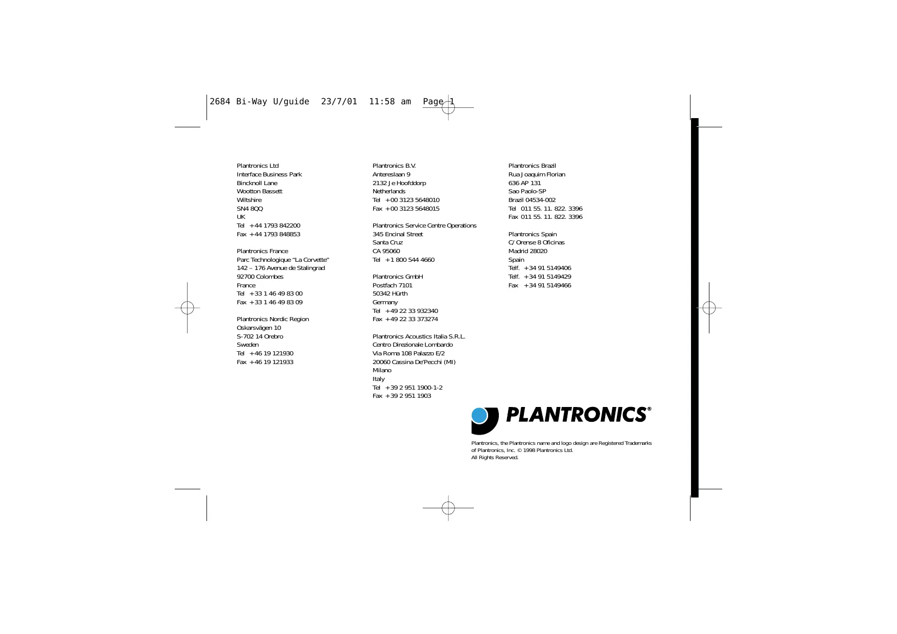 Bienvenue dans le monde des communications Mains Libres de Plantronics Les microcasques Plantronics sont conçus pour faciliter les communications mains libres lors de l'utilisation d'un téléphone. De nombreux téléphones disposent d'une prise spécifique pour l'utilisation d'un microcasque, mais lorsqu'il n'y en a pas ou que l'amplification n'est pas nécessaire, l'inverseur casque/combiné Bi-Way offre la solution la plus adaptée. Pour plus d'information sur la façon d'optimiser votre microcasque, veuillez vous reporter à sa notice d'utilisation. Fig 4 Branchez le cordon de connexion du Bi-Way dans la prise du combiné téléphonique sur le poste. Fig 5 L'utilisation du commutateur de positions vous permet maintenant de basculer de la position casque à la position combiné et ce, avant, pendant ou après un appel. le microcasque à votre téléphone. Ce réglage ne doit être effectué qu'une seule fois lors de l'installation de l'appareil. Installation: Fig 1 Déconnectez le combiné du téléphone. Fig 2 Branchez le cordon du combiné dans la prise portant le symbole d'un combiné située à l'arrière du Bi-Way. Fig 3 Branchez votre microcasque dans la prise portant le symbole d'un casque également située l'arrière du Bi-Way. Fig 6 Lorsqu'il est installé, l'atténuateur vous permet de réduire le volume sonore de la voix de votre correspondant. Dans ce cas, réglez le curseur pour adapter Fig 7 Le support casque peut être installé l'arrière du Bi-Way comme illustré. 2684 Bi-Way U/guide 23/7/01 11:58 am Page 22 Guide de Recherche des Pannes Problème Cause Possible Solution Je n'entends pas mon correspondant Position du commutateur casque/combiné Pour utiliser le Bi-Way avec votre microcasque, assurez vous que le commutateur est bien sur la position casque Combiné ou casque non raccordé Vérifiez que chaque câble est bien raccordé et sur la bonne prise Nettoyez ou remplacez le tube vocal du microcasque. Les correspondants ne m'entendent pas 2684 Bi-Way U/guide 23/7/01 11:58 am Page 25 Bi-Way