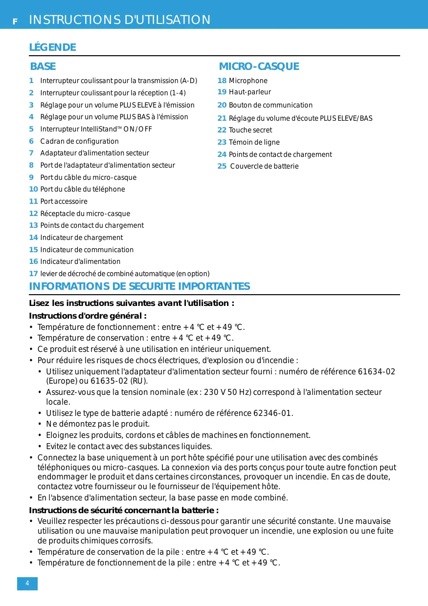 INSTRUCTIONS D'UTILISATION LÉGENDE BASE MICRO-CASQUE 1 Interrupteur coulissant pour la transmission (A-D) 18 Microphone 2 Interrupteur coulissant pour la réception (1-4) 19 Haut-parleur 3 Réglage pour un volume PLUS ELEVE à l'émission 20 Bouton de communication 4 Réglage pour un volume PLUS BAS à l'émission 21 Réglage du volume d'écoute PLUS ELEVE/BAS 5 Interrupteur IntelliStandTM ON/OFF 22 Touche secret 6 Cadran de configuration 23 Témoin de ligne 7 Adaptateur d'alimentation secteur 24 Points de contact de chargement 8 Port de l'adaptateur d'alimentation secteur 25 Couvercle de batterie 9 Port du câble du micro-casque 10 Port du câble du téléphone 11 Port accessoire 12 Réceptacle du micro-casque 13 Points de contact du chargement 14 Indicateur de chargement 15 Indicateur de communication 16 Indicateur d'alimentation 17 levier de décroché de combiné automatique (en option)