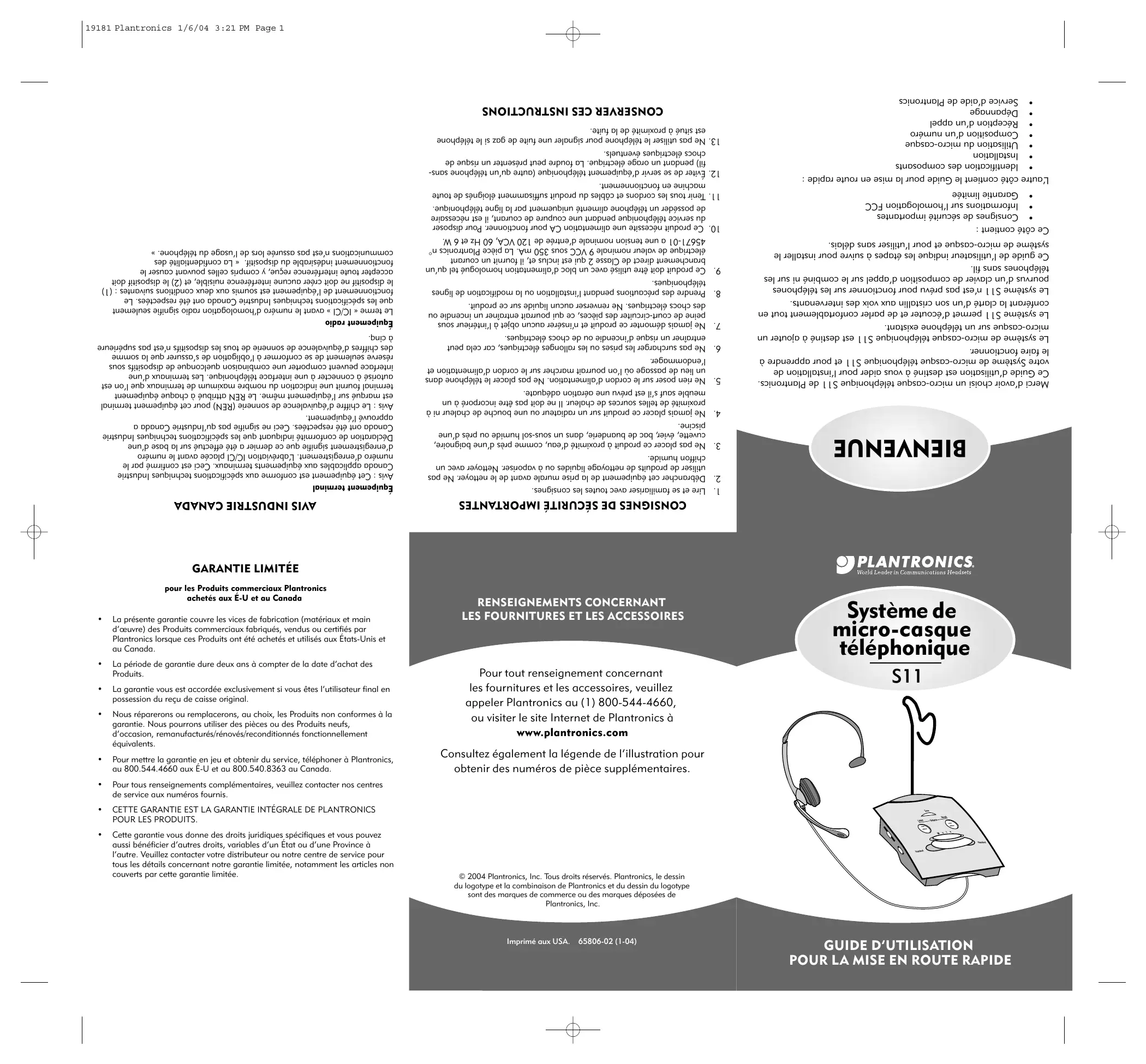 Cette garantie vous donne des droits juridiques spécifiques et vous pouvez aussi bénéficier d’autres droits, variables d’un État ou d’une Province à l’autre. Veuillez contacter votre distributeur ou notre centre de service pour tous les détails concernant notre garantie limitée, notamment les articles non couverts par cette garantie limitée. pour les Produits commerciaux Plantronics achetés aux É-U et au Canada Imprimé aux USA. 65806-02 (1-04)