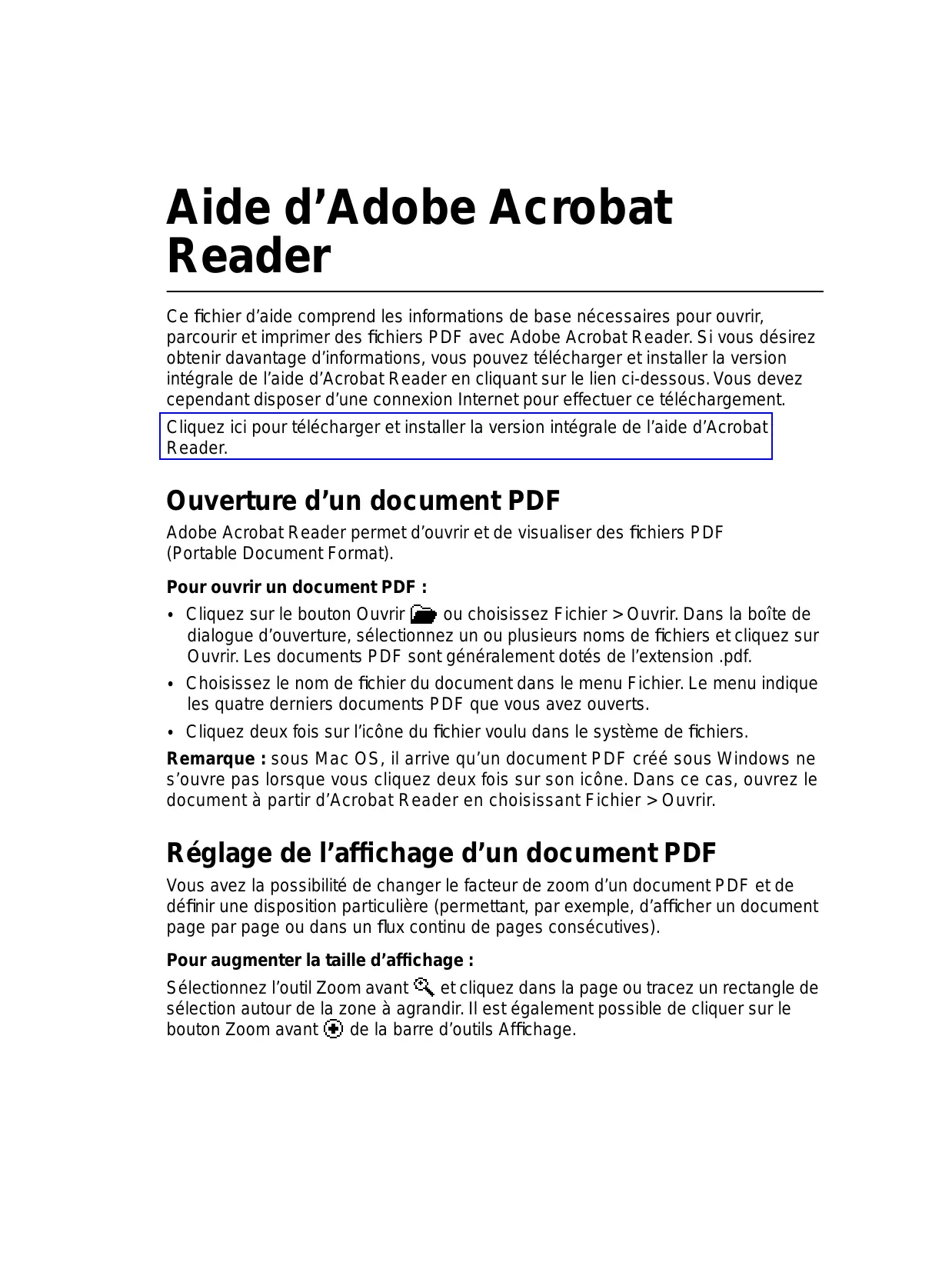 Ce fichier d'aide comprend les informations de base nécessaires pour ouvrir, parcourir et imprimer des fichiers PDF avec Adobe Acrobat Reader. Si vous désirez obtenir davantage d'informations, vous pouvez télécharger et installer la version intégrale de l'aide d'Acrobat Reader enclistuant sur le lien ci-dessous. Vous devez cependant dispose d'une connexion Internet pour effectuer ce téléchargement.