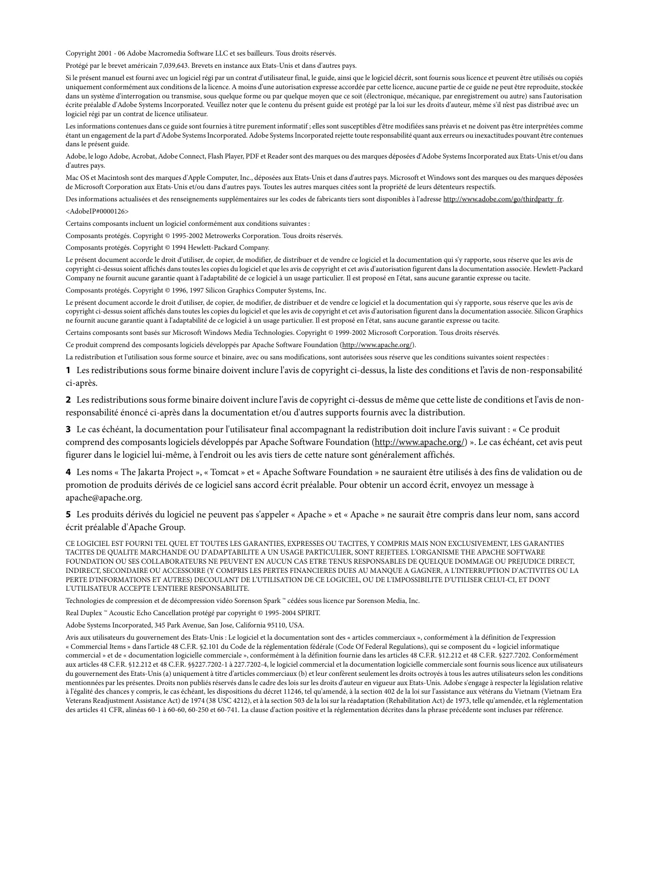 Copyright 2001 - 06 Adobe Macromedia Software LLC et ses bailleurs. Tous droits réservés. Copyright Protégé par le brevet américain 7,039,643. Brevets en instance aux Etats-Unis et dans d'autres pays. Si le présent manuel est fourni avec un logiciel régi par un contrat d'utilisateur final, le guide, ainsi que le logiciel décrit, sont fournis sous licence et peuvent être utilisés ou copiés uniquement conformément aux conditions de la licence. A moins d'une autorisation expresse accordée par cette licence, aucune partie de ce guide ne peut être reproduite, stockée dans un système d'interrogation ou transmise, sous quelque forme ou par quelque moyen que ce soit (électronique, mécanique, par enregistrement ou autre) sans l'autorisation écrite préalable d'Adobe Systems Incorporated. Veuillez noter que le contenu du présent guide est protégé par la loi sur les droits d'auteur, même s'il n’est pas distribué avec un logiciel régi par un contrat de licence utilisateur. Les informations contenues dans ce guide sont fournies à titre purement informatif ; elles sont susceptibles d'être modifiées sans préavis et ne doivent pas être interprétées comme étant un engagement de la part d'Adobe Systems Incorporated. Adobe Systems Incorporated rejette toute responsabilité quant aux erreurs ou inexactitudes pouvant être contenues dans le présent guide. Adobe, le logo Adobe, Acrobat, Adobe Connect, Flash Player, PDF et Reader sont des marques ou des marques déposées d'Adobe Systems Incorporated aux Etats-Unis et/ou dans d'autres pays. Mac OS et Macintosh sont des marques d'Apple Computer, Inc., déposées aux Etats-Unis et dans d'autres pays. Microsoft et Windows sont des marques ou des marques déposées de Microsoft Corporation aux Etats-Unis et/ou dans d'autres pays. Toutes les autres marques citées sont la propriété de leurs détenteurs respectifs. Des informations actualisées et des renseignements supplémentaires sur les codes de fabricants tiers sont disponibles à l'adresse http://www.adobe.com/go/thirdparty_fr. <AdobeIP#0000126> Certains composants incluent un logiciel conformément aux conditions suivantes : Composants protégés. Copyright © 1995-2002 Metrowerks Corporation. Tous droits réservés. Composants protégés. Copyright © 1994 Hewlett-Packard Company. Le présent document accorde le droit d'utiliser, de copier, de modifier, de distribuer et de vendre ce logiciel et la documentation qui s'y rapporte, sous réserve que les avis de copyright ci-dessus soient affichés dans toutes les copies du logiciel et que les avis de copyright et cet avis d'autorisation figurent dans la documentation associée. Hewlett-Packard Company ne fournit aucune garantie quant à l'adaptabilité de ce logiciel à un usage particulier. Il est proposé en l'état, sans aucune garantie expresse ou tacite. Composants protégés. Copyright © 1996, 1997 Silicon Graphics Computer Systems, Inc. Le présent document accorde le droit d'utiliser, de copier, de modifier, de distribuer et de vendre ce logiciel et la documentation qui s'y rapporte, sous réserve que les avis de copyright ci-dessus soient affichés dans toutes les copies du logiciel et que les avis de copyright et cet avis d'autorisation figurent dans la documentation associée. Silicon Graphics ne fournit aucune garantie quant à l'adaptabilité de ce logiciel à un usage particulier. Il est proposé en l'état, sans aucune garantie expresse ou tacite. Certains composants sont basés sur Microsoft Windows Media Technologies. Copyright © 1999-2002 Microsoft Corporation. Tous droits réservés. Ce produit comprend des composants logiciels développés par Apache Software Foundation (http://www.apache.org/). La redistribution et l'utilisation sous forme source et binaire, avec ou sans modifications, sont autorisées sous réserve que les conditions suivantes soient respectées : 1 Les redistributions sous forme binaire doivent inclure l'avis de copyright ci-dessus, la liste des conditions et l’avis de non-responsabilité ci-après. 2 Les redistributions sous forme binaire doivent inclure l'avis de copyright ci-dessus de même que cette liste de conditions et l'avis de nonresponsabilité énoncé ci-après dans la documentation et/ou d'autres supports fournis avec la distribution. 3 Le cas échéant, la documentation pour l'utilisateur final accompagnant la redistribution doit inclure l'avis suivant : « Ce produit comprend des composants logiciels développés par Apache Software Foundation (http://www.apache.org/) ». Le cas échéant, cet avis peut figurer dans le logiciel lui-même, à l'endroit ou les avis tiers de cette nature sont généralement affichés. 4 Les noms « The Jakarta Project », « Tomcat » et « Apache Software Foundation » ne sauraient être utilisés à des fins de validation ou de promotion de produits dérivés de ce logiciel sans accord écrit préalable. Pour obtenir un accord écrit, envoyez un message à apache@apache.org. 5 Les produits dérivés du logiciel ne peuvent pas s'appeler « Apache » et « Apache » ne saurait être compris dans leur nom, sans accord écrit préalable d'Apache Group. CE LOGICIEL EST FOURNI TEL QUEL ET TOUTES LES GARANTIES, EXPRESSES OU TACITES, Y COMPRIS MAIS NON EXCLUSIVEMENT, LES GARANTIES TACITES DE QUALITE MARCHANDE OU D'ADAPTABILITE A UN USAGE PARTICULIER, SONT REJETEES. L'ORGANISME THE APACHE SOFTWARE FOUNDATION OU SES COLLABORATEURS NE PEUVENT EN AUCUN CAS ETRE TENUS RESPONSABLES DE QUELQUE DOMMAGE OU PREJUDICE DIRECT, INDIRECT, SECONDAIRE OU ACCESSOIRE (Y COMPRIS LES PERTES FINANCIERES DUES AU MANQUE A GAGNER, A L'INTERRUPTION D'ACTIVITES OU LA PERTE D'INFORMATIONS ET AUTRES) DECOULANT DE L'UTILISATION DE CE LOGICIEL, OU DE L'IMPOSSIBILITE D'UTILISER CELUI-CI, ET DONT L'UTILISATEUR ACCEPTE L'ENTIERE RESPONSABILITE. Technologies de compression et de décompression vidéo Sorenson Spark ™ cédées sous licence par Sorenson Media, Inc. Real Dupl