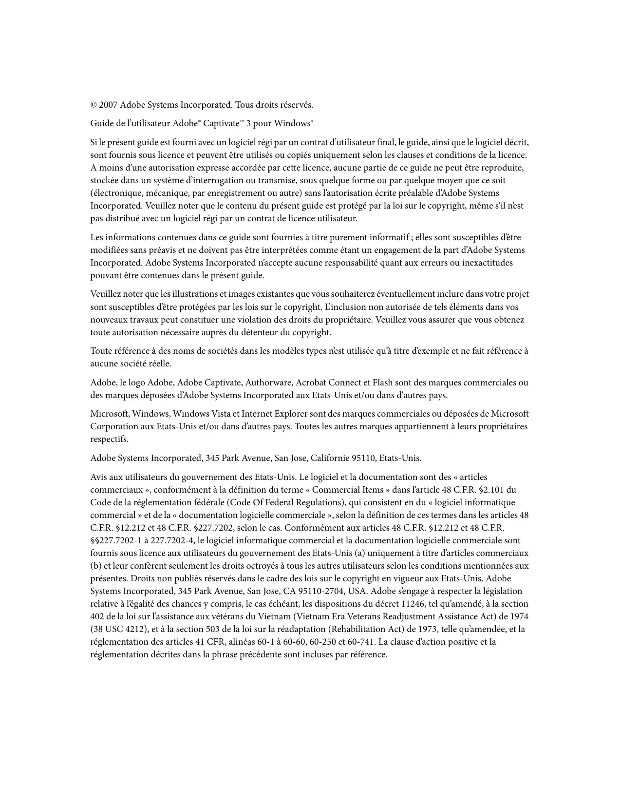 © 2007 Adobe Systems Incorporated. Tous droits réservés. Guide de l’utilisateur Adobe® Captivate™ 3 pour Windows® Si le présent guide est fourni avec un logiciel régi par un contrat d’utilisateur final, le guide, ainsi que le logiciel décrit, sont fournis sous licence et peuvent être utilisés ou copiés uniquement selon les clauses et conditions de la licence. A moins d’une autorisation expresse accordée par cette licence, aucune partie de ce guide ne peut être reproduite, stockée dans un système d’interrogation ou transmise, sous quelque forme ou par quelque moyen que ce soit (électronique, mécanique, par enregistrement ou autre) sans l’autorisation écrite préalable d’Adobe Systems Incorporated. Veuillez noter que le contenu du présent guide est protégé par la loi sur le copyright, même s’il n’est pas distribué avec un logiciel régi par un contrat de licence utilisateur. Les informations contenues dans ce guide sont fournies à titre purement informatif ; elles sont susceptibles d’être modifiées sans préavis et ne doivent pas être interprétées comme étant un engagement de la part d’Adobe Systems Incorporated. Adobe Systems Incorporated n’accepte aucune responsabilité quant aux erreurs ou inexactitudes pouvant être contenues dans le présent guide. Veuillez noter que les illustrations et images existantes que vous souhaiterez éventuellement inclure dans votre projet sont susceptibles d’être protégées par les lois sur le copyright. L’inclusion non autorisée de tels éléments dans vos nouveaux travaux peut constituer une violation des droits du propriétaire. Veuillez vous assurer que vous obtenez toute autorisation nécessaire auprès du détenteur du copyright. Toute référence à des noms de sociétés dans les modèles types n’est utilisée qu’à titre d’exemple et ne fait référence à aucune société réelle. Adobe, le logo Adobe, Adobe Captivate, Authorware, Acrobat Connect et Flash sont des marques commerciales ou des marques déposées d’Adobe Systems Incorporated aux Etats-Unis et/ou dans d'autres pays. Microsoft, Windows, Windows Vista et Internet Explorer sont des marques commerciales ou déposées de Microsoft Corporation aux Etats-Unis et/ou dans d’autres pays. Toutes les autres marques appartiennent à leurs propriétaires respectifs. Adobe Systems Incorporated, 345 Park Avenue, San Jose, Californie 95110, Etats-Unis. Avis aux utilisateurs du gouvernement des Etats-Unis. Le logiciel et la documentation sont des « articles commerciaux », conformément à la définition du terme « Commercial Items » dans l’article 48 C.F.R. §2.101 du Code de la réglementation fédérale (Code Of Federal Regulations), qui consistent en du « logiciel informatique commercial » et de la « documentation logicielle commerciale », selon la définition de ces termes dans les articles 48 C.F.R. §12.212 et 48 C.F.R. §227.7202, selon le cas. Conformément aux articles 48 C.F.R. §12.212 et 48 C.F.R. §§227.7202-1 à 227.7202-4, le logiciel informatique commercial et la documentation logicielle commerciale sont fournis sous licence aux utilisateurs du gouvernement des Etats-Unis (a) uniquement à titre d’articles commerciaux (b) et leur confèrent seulement les droits octroyés à tous les autres utilisateurs selon les conditions mentionnées aux présentes. Droits non publiés réservés dans le cadre des lois sur le copyright en vigueur aux Etats-Unis. Adobe Systems Incorporated, 345 Park Avenue, San Jose, CA 95110-2704, USA. Adobe s’engage à respecter la législation relative à l’égalité des chances y compris, le cas échéant, les dispositions du décret 11246, tel qu’amendé, à la section 402 de la loi sur l’assistance aux vétérans du Vietnam (Vietnam Era Veterans Readjustment Assistance Act) de 1974 (38 USC 4212), et à la section 503 de la loi sur la réadaptation (Rehabilitation Act) de 1973, telle qu’amendée, et la réglementation des articles 41 CFR, alinéas 60-1 à 60-60, 60-250 et 60-741. La clause d’action positive et la réglementation décrites dans la phrase précédente sont incluses par référence.