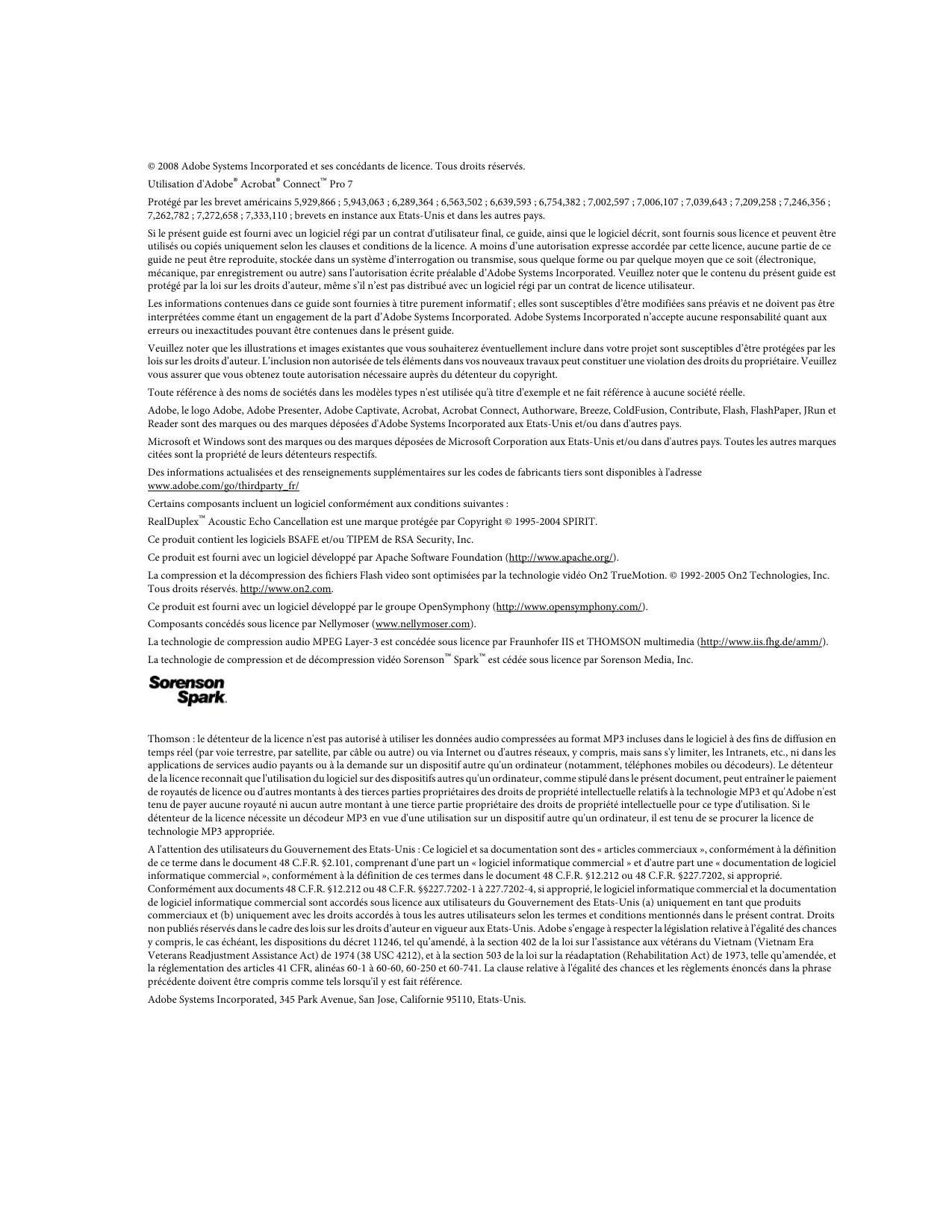 © 2008 Adobe Systems Incorporated et ses concédants de licence. Tous droits réservés. Copyright Utilisation d'Adobe® Acrobat® Connect™ Pro 7 Protégé par les brevet américains 5,929,866 ; 5,943,063 ; 6,289,364 ; 6,563,502 ; 6,639,593 ; 6,754,382 ; 7,002,597 ; 7,006,107 ; 7,039,643 ; 7,209,258 ; 7,246,356 ; 7,262,782 ; 7,272,658 ; 7,333,110 ; brevets en instance aux Etats-Unis et dans les autres pays. Si le présent guide est fourni avec un logiciel régi par un contrat d'utilisateur final, ce guide, ainsi que le logiciel décrit, sont fournis sous licence et peuvent être utilisés ou copiés uniquement selon les clauses et conditions de la licence. A moins d’une autorisation expresse accordée par cette licence, aucune partie de ce guide ne peut être reproduite, stockée dans un système d’interrogation ou transmise, sous quelque forme ou par quelque moyen que ce soit (électronique, mécanique, par enregistrement ou autre) sans l’autorisation écrite préalable d’Adobe Systems Incorporated. Veuillez noter que le contenu du présent guide est protégé par la loi sur les droits d’auteur, même s’il n’est pas distribué avec un logiciel régi par un contrat de licence utilisateur. Les informations contenues dans ce guide sont fournies à titre purement informatif ; elles sont susceptibles d’être modifiées sans préavis et ne doivent pas être interprétées comme étant un engagement de la part d’Adobe Systems Incorporated. Adobe Systems Incorporated n’accepte aucune responsabilité quant aux erreurs ou inexactitudes pouvant être contenues dans le présent guide. Veuillez noter que les illustrations et images existantes que vous souhaiterez éventuellement inclure dans votre projet sont susceptibles d’être protégées par les lois sur les droits d’auteur. L’inclusion non autorisée de tels éléments dans vos nouveaux travaux peut constituer une violation des droits du propriétaire. Veuillez vous assurer que vous obtenez toute autorisation nécessaire auprès du détenteur du copyright. Toute référence à des noms de sociétés dans les modèles types n'est utilisée qu'à titre d'exemple et ne fait référence à aucune société réelle. Adobe, le logo Adobe, Adobe Presenter, Adobe Captivate, Acrobat, Acrobat Connect, Authorware, Breeze, ColdFusion, Contribute, Flash, FlashPaper, JRun et Reader sont des marques ou des marques déposées d'Adobe Systems Incorporated aux Etats-Unis et/ou dans d'autres pays. Microsoft et Windows sont des marques ou des marques déposées de Microsoft Corporation aux Etats-Unis et/ou dans d'autres pays. Toutes les autres marques citées sont la propriété de leurs détenteurs respectifs. Des informations actualisées et des renseignements supplémentaires sur les codes de fabricants tiers sont disponibles à l'adresse www.adobe.com/go/thirdparty_fr/ Certains composants incluent un logiciel conformément aux conditions suivantes : RealDuplex™ Acoustic Echo Cancellation est une marque protégée par Copyright © 1995-2004 SPIRIT. Ce produit contient les logiciels BSAFE et/ou TIPEM de RSA Security, Inc. Ce produit est fourni avec un logiciel développé par Apache Software Foundation (http://www.apache.org/). La compression et la décompression des fichiers Flash video sont optimisées par la technologie vidéo On2 TrueMotion. © 1992-2005 On2 Technologies, Inc. Tous droits réservés. http://www.on2.com. Ce produit est fourni avec un logiciel développé par le groupe OpenSymphony (http://www.opensymphony.com/). Composants concédés sous licence par Nellymoser (www.nellymoser.com). La technologie de compression audio MPEG Layer-3 est concédée sous licence par Fraunhofer IIS et THOMSON multimedia (http://www.iis.fhg.de/amm/). La technologie de compression et de décompression vidéo Sorenson™ Spark™ est cédée sous licence par Sorenson Media, Inc. Thomson : le détenteur de la licence n'est pas autorisé à utiliser les données audio compressées au format MP3 incluses dans le logiciel à des fins de diffusion en temps réel (par voie terrestre, par satellite, par câble ou autre) ou via Internet ou d'autres réseaux, y compris, mais sans s'y limiter, les Intranets, etc., ni dans les applications de services audio payants ou à la demande sur un dispositif autre qu'un ordinateur (notamment, téléphones mobiles ou décodeurs). Le détenteur de la licence reconnaît que l'utilisation du logiciel sur des dispositifs autres qu'un ordinateur, comme stipulé dans le présent document, peut entraîner le paiement de royautés de licence ou d'autres montants à des tierces parties propriétaires des droits de propriété intellectuelle relatifs à la technologie MP3 et qu'Adobe n'est tenu de payer aucune royauté ni aucun autre montant à une tierce partie propriétaire des droits de propriété intellectuelle pour ce type d'utilisation. Si le détenteur de la licence nécessite un décodeur MP3 en vue d'une utilisation sur un dispositif autre qu'un ordinateur, il est tenu de se procurer la licence de technologie MP3 appropriée. A l'attention des utilisateurs du Gouvernement des Etats-Unis : Ce logiciel et sa documentation sont des « articles commerciaux », conformément à la définition de ce terme dans le document 48 C.F.R. §2.101, comprenant d'une part un « logiciel informatique commercial » et d'autre part une « documentation de logiciel informatique commercial », conformément à la définition de ces termes dans le document 48 C.F.R. §12.212 ou 48 C.F.R. §227.7202, si approprié. Conformément aux documents 48 C.F.R. §12.212 ou 48 C.F.R. §§227.7202-1 à 227.7202-4, si approprié, le logiciel informatique commercial et la documentation de logiciel informatique commercial sont accordés sous licence aux utilisateurs du Gouvernement des Etats-Unis (a) uniquement en tant que produits commerciaux et (b) uniquement avec les droits accordés à tous les autres utilisateurs selon les termes et condi