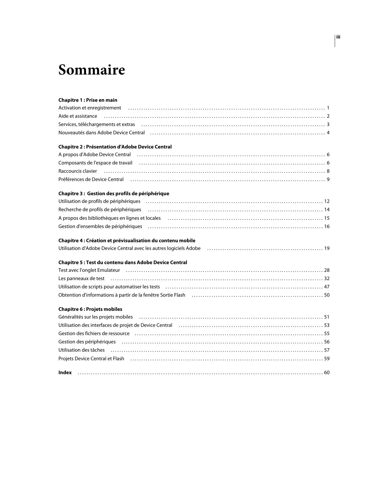 © 2008 Adobe Systems Incorporated. Tous droits réservés. Copyright Protégé par les brevets américains 5 546 528, 5 870 091, 6 411 730, 6 711 557, 6 964 051 et 6 970 749 ; brevets en instance aux Etats-Unis et dans d'autres pays. Utilisation d'Adobe® Device Central 2.1 pour Windows® et Mac OS S'il est distribué avec un logiciel comprenant un contrat de licence, ce manuel, ainsi que le logiciel qui y est décrit, sont cédés sous licence et ne peuvent être utilisés ou copiés que conformément à la présente licence. Sauf lorsque cela est prévu par la licence, aucune partie de ce manuel ne peut être reproduite, conservée sur un support de stockage ou transmise par un moyen ou sous une forme quelconque (électronique, mécanique, enregistrée ou autre), sans l'autorisation écrite préalable d'Adobe Systems Incorporated. Veuillez noter que le contenu de ce manuel est protégé par des droits d'auteur, même s'il n'est pas distribué avec un logiciel comprenant un contrat de licence. Les informations contenues dans ce manuel sont fournies à titre purement indicatif et ne doivent pas être considérées comme un engagement de la part d'Adobe Systems Incorporated, qui se réserve le droit de les modifier sans préavis. Adobe Systems Incorporated décline toute responsabilité en cas d'éventuelles erreurs ou inexactitudes relevées dans le contenu informationnel de ce manuel. Nous attirons votre attention sur le fait que les illustrations ou images que vous pouvez être amené à inclure dans vos projets sont peut-être protégées par des droits d'auteur. L'exploitation de matériel protégé sans l'autorisation de l'auteur constitue une violation de droit. Assurez-vous d'obtenir les autorisations requises avant de procéder. Toutes les références à des noms de sociétés utilisés dans les modèles sont purement fictives et ne renvoient à aucune entreprise existante. Adobe, the Adobe logo, Adobe Premiere, ActionScript, After Effects, Captivate, Creative Suite, Dreamweaver, Flash, Flash Lite, Illustrator, and Photoshop are either registered trademarks or trademarks of Adobe Systems Incorporated in the United States and/or other countries. Windows is either a registered trademark or trademark of Microsoft Corporation in the United States and/or other countries. Macintosh and Mac OS are trademarks of Apple Inc., registered in the U.S. and other countries. All other trademarks are the property of their respective owners. This product contains either BISAFE and/or TIPEM software by RSA Data Security, Inc. This product includes software developed by the Apache Software Foundation (www.apache.org). Portions copyright 2000 Group 42, Inc. and the Contributing Authors. MD5.CPP - RSA Data Security, Inc., MD5 message-digest algorithm. Copyright © 1991-2, RSA Data Security, Inc. Created 1991. All rights reserved. Flash video compression and decompression is powered by On2 TrueMotion video technology. Portions © 1992-2005 On2 Technologies, Inc. All Rights Reserved. http://www.on2.com. This product includes software developed by the OpenSymphony Group (http://www.opensymphony.com/). Portions of technology licensed by Nellymoser, Inc. (www.nellymoser.com) Sorenson Spark™ video compression and decompression technology licensed from Sorenson Media, Inc. MPEG Layer-3 audio compression technology licensed by Fraunhofer IIS and THOMSON multimedia (http://www.iis.fhg.de/amm/). MPEG Layer-3 audio coding technology licensed from Fraunhofer IIS and Thomson. mp3 Surround audio coding technology licensed from Fraunhofer IIS, Agere Systems and Thomson. mp3PRO audio coding technologies licensed from Coding Technologies, Fraunhofer IIS and Thomson Multimedia. Adobe Systems Incorporated, 345 Park Avenue, San Jose, California 95110, USA. Notice to U.S. Government End Users: The Software and Documentation are “Commercial Items,” as that term is defined at 48 C.F.R. §2.101, consisting of “Commercial Computer Software” and “Commercial Computer Software Documentation,” as such terms are used in 48 C.F.R. §12.212 or 48 C.F.R. §227.7202, as applicable. Consistent with 48 C.F.R. §12.212 or 48 C.F.R. §§227.7202-1 through 227.7202-4, as applicable, the Commercial Computer Software and Commercial Computer Software Documentation are being licensed to U.S. Government end users (a) only as Commercial Items and (b) with only those rights as are granted to all other end users pursuant to the terms and conditions herein. Unpublished-rights reserved under the copyright laws of the United States. Adobe agrees to comply with all applicable equal opportunity laws including, if appropriate, the provisions of Executive Order 11246, as amended, Section 402 of the Vietnam Era Veterans Readjustment Assistance Act of 1974 (38 USC 4212), and Section 503 of the Rehabilitation Act of 1973, as amended, and the regulations at 41 CFR Parts 60-1 through 60-60, 60-250, and 60-741. The affirmative action clause and regulations contained in the preceding sentence shall be incorporated by reference. iii Sommaire