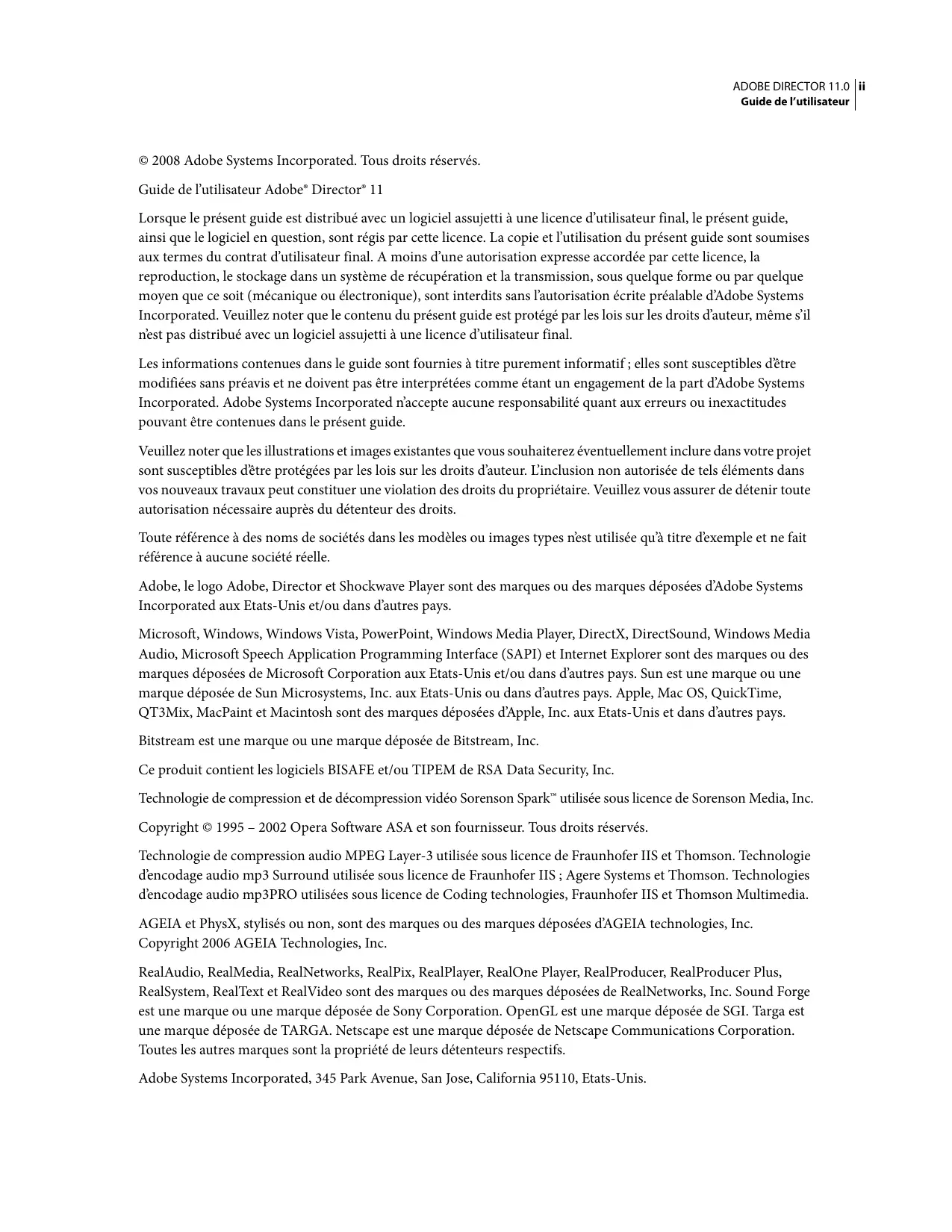 ADOBE DIRECTOR 11.0 ii Guide de l’utilisateur © 2008 Adobe Systems Incorporated. Tous droits réservés. Guide de l’utilisateur Adobe® Director® 11 Lorsque le présent guide est distribué avec un logiciel assujetti à une licence d’utilisateur final, le présent guide, ainsi que le logiciel en question, sont régis par cette licence. La copie et l’utilisation du présent guide sont soumises aux termes du contrat d’utilisateur final. A moins d’une autorisation expresse accordée par cette licence, la reproduction, le stockage dans un système de récupération et la transmission, sous quelque forme ou par quelque moyen que ce soit (mécanique ou électronique), sont interdits sans l’autorisation écrite préalable d’Adobe Systems Incorporated. Veuillez noter que le contenu du présent guide est protégé par les lois sur les droits d’auteur, même s’il n’est pas distribué avec un logiciel assujetti à une licence d’utilisateur final. Les informations contenues dans le guide sont fournies à titre purement informatif ; elles sont susceptibles d’être modifiées sans préavis et ne doivent pas être interprétées comme étant un engagement de la part d’Adobe Systems Incorporated. Adobe Systems Incorporated n’accepte aucune responsabilité quant aux erreurs ou inexactitudes pouvant être contenues dans le présent guide. Veuillez noter que les illustrations et images existantes que vous souhaiterez éventuellement inclure dans votre projet sont susceptibles d’être protégées par les lois sur les droits d’auteur. L’inclusion non autorisée de tels éléments dans vos nouveaux travaux peut constituer une violation des droits du propriétaire. Veuillez vous assurer de détenir toute autorisation nécessaire auprès du détenteur des droits. Toute référence à des noms de sociétés dans les modèles ou images types n’est utilisée qu’à titre d’exemple et ne fait référence à aucune société réelle. Adobe, le logo Adobe, Director et Shockwave Player sont des marques ou des marques déposées d’Adobe Systems Incorporated aux Etats-Unis et/ou dans d’autres pays. Microsoft, Windows, Windows Vista, PowerPoint, Windows Media Player, DirectX, DirectSound, Windows Media Audio, Microsoft Speech Application Programming Interface (SAPI) et Internet Explorer sont des marques ou des marques déposées de Microsoft Corporation aux Etats-Unis et/ou dans d’autres pays. Sun est une marque ou une marque déposée de Sun Microsystems, Inc. aux Etats-Unis ou dans d’autres pays. Apple, Mac OS, QuickTime, QT3Mix, MacPaint et Macintosh sont des marques déposées d’Apple, Inc. aux Etats-Unis et dans d’autres pays. Bitstream est une marque ou une marque déposée de Bitstream, Inc. Ce produit contient les logiciels BISAFE et/ou TIPEM de RSA Data Security, Inc. Technologie de compression et de décompression vidéo Sorenson Spark™ utilisée sous licence de Sorenson Media, Inc. Copyright © 1995 – 2002 Opera Software ASA et son fournisseur. Tous droits réservés. Technologie de compression audio MPEG Layer-3 utilisée sous licence de Fraunhofer IIS et Thomson. Technologie d’encodage audio mp3 Surround utilisée sous licence de Fraunhofer IIS ; Agere Systems et Thomson. Technologies d’encodage audio mp3PRO utilisées sous licence de Coding technologies, Fraunhofer IIS et Thomson Multimedia. AGEIA et PhysX, stylisés ou non, sont des marques ou des marques déposées d’AGEIA technologies, Inc. Copyright 2006 AGEIA Technologies, Inc. RealAudio, RealMedia, RealNetworks, RealPix, RealPlayer, RealOne Player, RealProducer, RealProducer Plus, RealSystem, RealText et RealVideo sont des marques ou des marques déposées de RealNetworks, Inc. Sound Forge est une marque ou une marque déposée de Sony Corporation. OpenGL est une marque déposée de SGI. Targa est une marque déposée de TARGA. Netscape est une marque déposée de Netscape Communications Corporation. Toutes les autres marques sont la propriété de leurs détenteurs respectifs. Adobe Systems Incorporated, 345 Park Avenue, San Jose, California 95110, Etats-Unis. ADOBE DIRECTOR 11.0 iii Guide de l’utilisateur Avis aux utilisateurs du gouvernement des Etats-Unis. Ce logiciel et la documentation attenante font partie des « Commercial Items », visés à l’article 48 C.F.R., alinéa 2.101, qui se composent des « Commercial computer software » et « Commercial Computer Software Documentation », visés à l’article 48 C.F.R., alinéa 12.212 ou 48 C.F.R., alinéa 227.7202, selon le cas. Conformément à l’article 48 C.F.R., alinéa 12.212 ou à l’article 48 C.F.R., alinéas 227.7202-1 à 227.7202-4, selon le cas, la licence des « Commercial Computer Software » et « Commercial Computer Software Documentation » est accordée aux utilisateurs finaux faisant partie du gouvernement des EtatsUnis (a) en tant que « Commercial Items » et (b) uniquement selon les droits accordés à tous les autres utilisateurs selon les conditions mentionnées dans les présentes. Droits non publiés réservés dans le cadre des lois sur les droits d’auteur en vigueur aux Etats-Unis. Adobe Systems Incorporated, 345 Park Avenue, San Jose, CA 95110, Etats-Unis. A l’attention des utilisateurs du gouvernement des Etats-Unis, Adobe s’engage à respecter la législation relative à l’égalité des chances y compris, le cas échéant, les dispositions du décret 11246, tel qu’amendé, à la section 402 de la loi sur l’assistance aux vétérans du Vietnam (Vietnam Era Veterans Readjustment Assistance Act) de 1974 (38 USC 4212) et à la section 503 de la loi sur la réadaptation (Rehabilitation Act) de 1973, telle qu’amendée, et la réglementation des articles 41 CFR, alinéas 60-1 à 60-60, 60-250 et 60-741. La clause d’action positive et la réglementation décrites dans la phrase précédente sont incluses par référence.