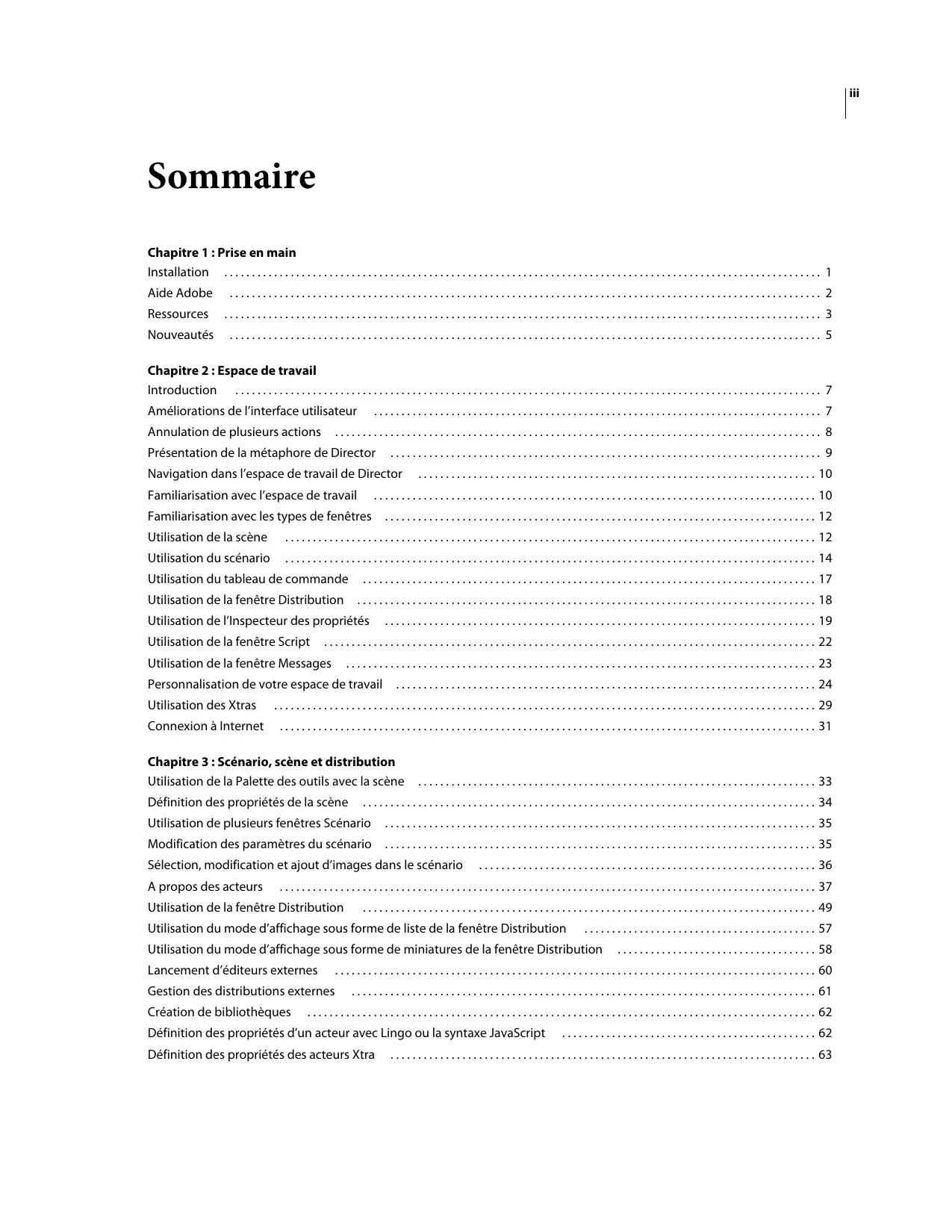 UTILISATION DE DIRECTOR 11.5 vi Sommaire Vérification de texte spécifique avec Lingo ou la syntaxe JavaScript Modification de chaînes avec Lingo ou la syntaxe JavaScript Prise en charge d’Unicode dans Director