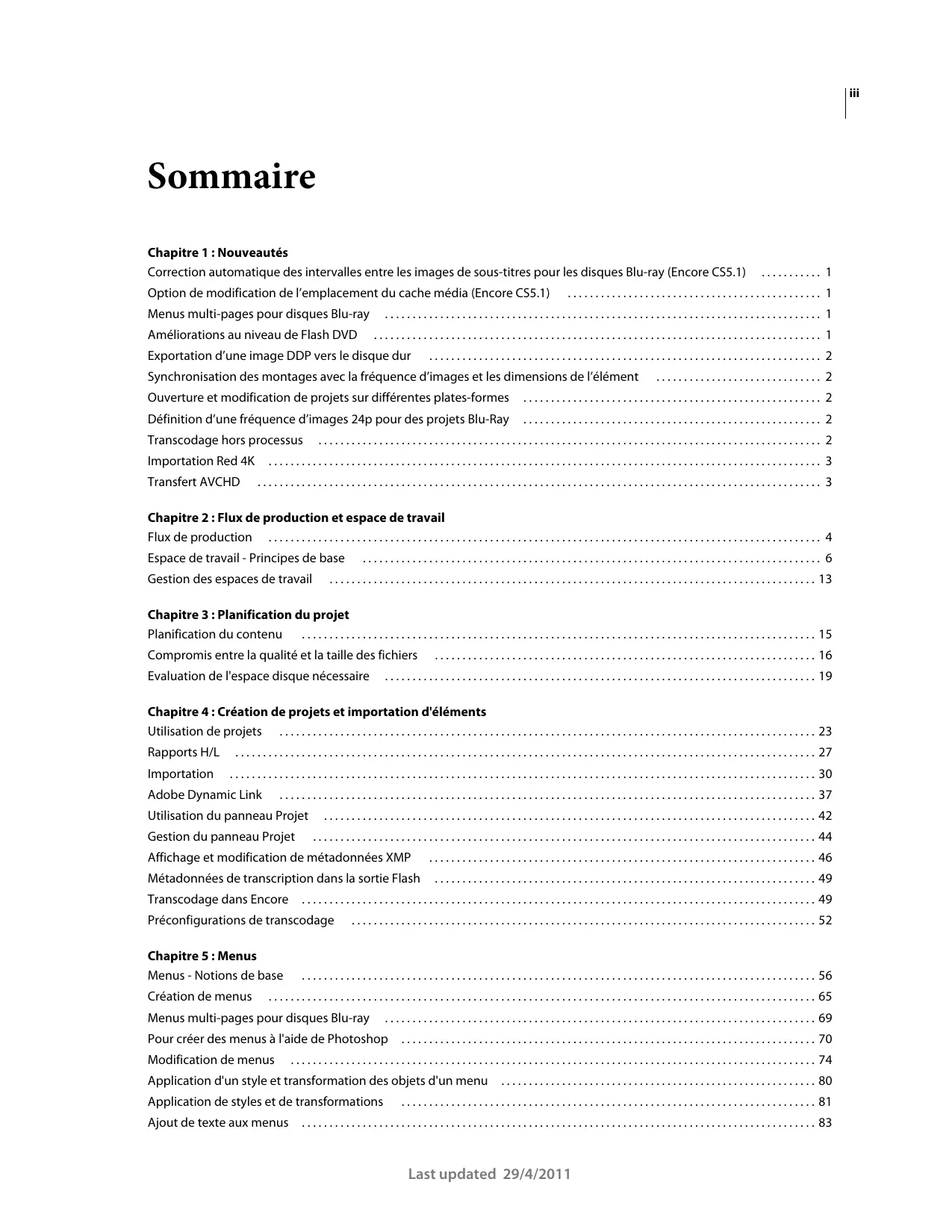 Utilisation d'ADOBE® ENCORE® CS5 Informations juridiques Informations juridiques Pour consulter les informations juridiques, consultez la page http://help.adobe.com/fr_FR/legalnotices/index.html. Last updated 29/4/2011 iii Sommaire