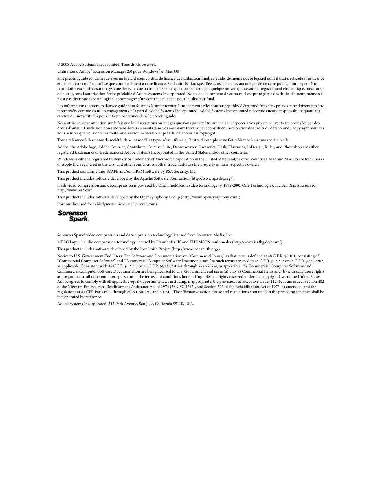 © 2008 Adobe Systems Incorporated. Tous droits réservés. Copyright Utilisation d'Adobe® Extension Manager 2.0 pour Windows® et Mac OS Si le présent guide est distribué avec un logiciel sous contrat de licence de l’utilisateur final, ce guide, de même que le logiciel dont il traite, est cédé sous licence et ne peut être copié ou utilisé que conformément à cette licence. Sauf autorisation spécifiée dans la licence, aucune partie de cette publication ne peut être reproduite, enregistrée sur un système de recherche ou transmise sous quelque forme ou par quelque moyen que ce soit (enregistrement électronique, mécanique ou autre), sans l’autorisation écrite préalable d’Adobe Systems Incorporated. Notez que le contenu de ce manuel est protégé par des droits d’auteur, même s’il n’est pas distribué avec un logiciel accompagné d’un contrat de licence pour l’utilisateur final. Les informations contenues dans ce guide sont fournies à titre informatif uniquement ; elles sont susceptibles d’être modifiées sans préavis et ne doivent pas être interprétées comme étant un engagement de la part d’Adobe Systems Incorporated. Adobe Systems Incorporated n’accepte aucune responsabilité quant aux erreurs ou inexactitudes pouvant être contenues dans le présent guide. Nous attirons votre attention sur le fait que les illustrations ou images que vous pouvez être amené à incorporer à vos projets peuvent être protégées par des droits d’auteur. L’inclusion non autorisée de tels éléments dans vos nouveaux travaux peut constituer une violation des droits du détenteur du copyright. Veuillez vous assurer que vous obtenez toute autorisation nécessaire auprès du détenteur du copyright. Toute référence à des noms de sociétés dans les modèles types n’est utilisée qu’à titre d’exemple et ne fait référence à aucune société réelle. Adobe, the Adobe logo, Adobe Connect, Contribute, Creative Suite, Dreamweaver, Fireworks, Flash, Illustrator, InDesign, Kuler, and Photoshop are either registered trademarks or trademarks of Adobe Systems Incorporated in the United States and/or other countries. Windows is either a registered trademark or trademark of Microsoft Corporation in the United States and/or other countries. Mac and Mac OS are trademarks of Apple Inc. registered in the U.S. and other countries. All other trademarks are the property of their respective owners. This product contains either BSAFE and/or TIPEM software by RSA Security, Inc. This product includes software developed by the Apache Software Foundation (http://www.apache.org/). Flash video compression and decompression is powered by On2 TrueMotion video technology. © 1992-2005 On2 Technologies, Inc. All Rights Reserved. http://www.on2.com. This product includes software developed by the OpenSymphony Group (http://www.opensymphony.com/). Portions licensed from Nellymoser (www.nellymoser.com). Sorenson Spark® video compression and decompression technology licensed from Sorenson Media, Inc. MPEG Layer-3 audio compression technology licensed by Fraunhofer IIS and THOMSON multimedia (http://www.iis.fhg.de/amm/). This product includes software developed by the IronSmith Project (http://www.ironsmith.org/). Notice to U.S. Government End Users: The Software and Documentation are “Commercial Items,” as that term is defined at 48 C.F.R. §2.101, consisting of “Commercial Computer Software” and “Commercial Computer Software Documentation,” as such terms are used in 48 C.F.R. §12.212 or 48 C.F.R. §227.7202, as applicable. Consistent with 48 C.F.R. §12.212 or 48 C.F.R. §§227.7202-1 through 227.7202-4, as applicable, the Commercial Computer Software and Commercial Computer Software Documentation are being licensed to U.S. Government end users (a) only as Commercial Items and (b) with only those rights as are granted to all other end users pursuant to the terms and conditions herein. Unpublished-rights reserved under the copyright laws of the United States. Adobe agrees to comply with all applicable equal opportunity laws including, if appropriate, the provisions of Executive Order 11246, as amended, Section 402 of the Vietnam Era Veterans Readjustment Assistance Act of 1974 (38 USC 4212), and Section 503 of the Rehabilitation Act of 1973, as amended, and the regulations at 41 CFR Parts 60-1 through 60-60, 60-250, and 60-741. The affirmative action clause and regulations contained in the preceding sentence shall be incorporated by reference. Adobe Systems Incorporated, 345 Park Avenue, San Jose, California 95110, USA. iii Sommaire