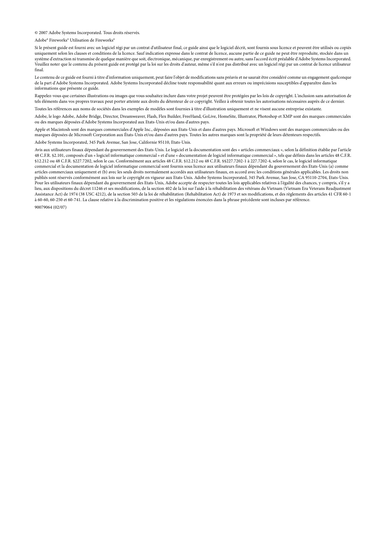 © 2007 Adobe Systems Incorporated. Tous droits réservés. Adobe® Fireworks® Utilisation de Fireworks® Si le présent guide est fourni avec un logiciel régi par un contrat d'utilisateur final, ce guide ainsi que le logiciel décrit, sont fournis sous licence et peuvent être utilisés ou copiés uniquement selon les clauses et conditions de la licence. Sauf indication expresse dans le contrat de licence, aucune partie de ce guide ne peut être reproduite, stockée dans un système d'extraction ni transmise de quelque manière que soit, électronique, mécanique, par enregistrement ou autre, sans l'accord écrit préalable d'Adobe Systems Incorporated. Veuillez noter que le contenu du présent guide est protégé par la loi sur les droits d'auteur, même s'il n'est pas distribué avec un logiciel régi par un contrat de licence utilisateur final. Le contenu de ce guide est fourni à titre d'information uniquement, peut faire l'objet de modifications sans préavis et ne saurait être considéré comme un engagement quelconque de la part d'Adobe Systems Incorporated. Adobe Systems Incorporated décline toute responsabilité quant aux erreurs ou imprécisions susceptibles d'apparaître dans les informations que présente ce guide. Rappelez-vous que certaines illustrations ou images que vous souhaitez inclure dans votre projet peuvent être protégées par les lois de copyright. L'inclusion sans autorisation de tels éléments dans vos propres travaux peut porter atteinte aux droits du détenteur de ce copyright. Veillez à obtenir toutes les autorisations nécessaires auprès de ce dernier. Toutes les références aux noms de sociétés dans les exemples de modèles sont fournies à titre d'illustration uniquement et ne visent aucune entreprise existante. Adobe, le logo Adobe, Adobe Bridge, Director, Dreamweaver, Flash, Flex Builder, FreeHand, GoLive, HomeSite, Illustrator, Photoshop et XMP sont des marques commerciales ou des marques déposées d'Adobe Systems Incorporated aux Etats-Unis et/ou dans d'autres pays. Apple et Macintosh sont des marques commerciales d'Apple Inc., déposées aux Etats-Unis et dans d'autres pays. Microsoft et Windows sont des marques commerciales ou des marques déposées de Microsoft Corporation aux États-Unis et/ou dans d'autres pays. Toutes les autres marques sont la propriété de leurs détenteurs respectifs. Adobe Systems Incorporated, 345 Park Avenue, San Jose, Californie 95110, Etats-Unis. Avis aux utilisateurs finaux dépendant du gouvernement des Etats-Unis. Le logiciel et la documentation sont des « articles commerciaux », selon la définition établie par l'article 48 C.F.R. §2.101, composés d'un « logiciel informatique commercial » et d'une « documentation de logiciel informatique commercial », tels que définis dans les articles 48 C.F.R. §12.212 ou 48 C.F.R. §227.7202, selon le cas. Conformément aux articles 48 C.F.R. §12.212 ou 48 C.F.R. §§227.7202-1 à 227.7202-4, selon le cas, le logiciel informatique commercial et la documentation de logiciel informatique commercial sont fournis sous licence aux utilisateurs finaux dépendant du gouvernement des Etats-Unis (a) comme articles commerciaux uniquement et (b) avec les seuls droits normalement accordés aux utilisateurs finaux, en accord avec les conditions générales applicables. Les droits non publiés sont réservés conformément aux lois sur le copyright en vigueur aux Etats-Unis. Adobe Systems Incorporated, 345 Park Avenue, San Jose, CA 95110-2704, Etats-Unis. Pour les utilisateurs finaux dépendant du gouvernement des Etats-Unis, Adobe accepte de respecter toutes les lois applicables relatives à l'égalité des chances, y compris, s'il y a lieu, aux dispositions du décret 11246 et ses modifications, de la section 402 de la loi sur l'aide à la réhabilitation des vétérans du Vietnam (Vietnam Era Veterans Readjustment Assistance Act) de 1974 (38 USC 4212), de la section 503 de la loi de réhabilitation (Rehabilitation Act) de 1973 et ses modifications, et des règlements des articles 41 CFR 60-1 à 60-60, 60-250 et 60-741. La clause relative à la discrimination positive et les régulations énoncées dans la phrase précédente sont incluses par référence. 90079064 (02/07) iii Table des matières