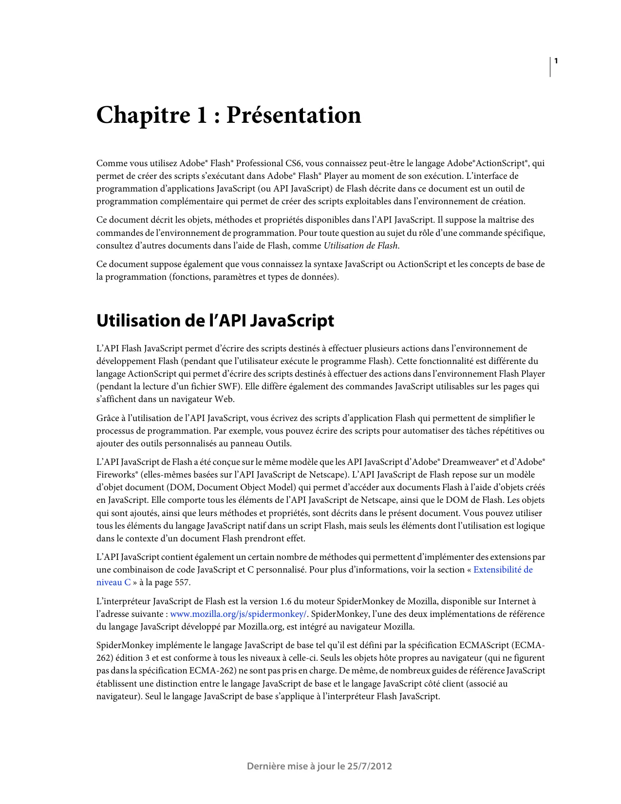 Comme vous utilisez Adobe® Flash® Professional CS6, vous connaissez peut-être le langage Adobe®ActionScript®, qui permet de créer des scripts s’exécutant dans Adobe® Flash® Player au moment de son exécution. L’interface de programmation d’applications JavaScript (ou API JavaScript) de Flash décrite dans ce document est un outil de programmation complémentaire qui permet de créer des scripts exploitables dans l’environnement de création. Ce document décrit les objets, méthodes et propriétés disponibles dans l’API JavaScript. Il suppose la maîtrise des commandes de l’environnement de programmation. Pour toute question au sujet du rôle d’une commande spécifique, consultez d’autres documents dans l’aide de Flash, comme Utilisation de Flash. Ce document suppose également que vous connaissez la syntaxe JavaScript ou ActionScript et les concepts de base de la programmation (fonctions, paramètres et types de données). Utilisation de l’API JavaScript L’API Flash JavaScript permet d’écrire des scripts destinés à effectuer plusieurs actions dans l’environnement de développement Flash (pendant que l’utilisateur exécute le programme Flash). Cette fonctionnalité est différente du langage ActionScript qui permet d’écrire des scripts destinés à effectuer des actions dans l’environnement Flash Player (pendant la lecture d’un fichier SWF). Elle diffère également des commandes JavaScript utilisables sur les pages qui s’affichent dans un navigateur Web. Grâce à l’utilisation de l’API JavaScript, vous écrivez des scripts d’application Flash qui permettent de simplifier le processus de programmation. Par exemple, vous pouvez écrire des scripts pour automatiser des tâches répétitives ou ajouter des outils personnalisés au panneau Outils. L’API JavaScript de Flash a été conçue sur le même modèle que les API JavaScript d’Adobe® Dreamweaver® et d’Adobe® Fireworks® (elles-mêmes basées sur l’API JavaScript de Netscape). L’API JavaScript de Flash repose sur un modèle d’objet document (DOM, Document Object Model) qui permet d’accéder aux documents Flash à l’aide d’objets créés en JavaScript. Elle comporte tous les éléments de l’API JavaScript de Netscape, ainsi que le DOM de Flash. Les objets qui sont ajoutés, ainsi que leurs méthodes et propriétés, sont décrits dans le présent document. Vous pouvez utiliser tous les éléments du langage JavaScript natif dans un script Flash, mais seuls les éléments dont l’utilisation est logique dans le contexte d’un document Flash prendront effet. L’API JavaScript contient également un certain nombre de méthodes qui permettent d’implémenter des extensions par une combinaison de code JavaScript et C personnalisé. Pour plus d’informations, voir la section « Extensibilité de niveau C » à la page 557. L’interpréteur JavaScript de Flash est la version 1.6 du moteur SpiderMonkey de Mozilla, disponible sur Internet à l’adresse suivante : www.mozilla.org/js/spidermonkey/. SpiderMonkey, l’une des deux implémentations de référence du langage JavaScript développé par Mozilla.org, est intégré au navigateur Mozilla. SpiderMonkey implémente le langage JavaScript de base tel qu’il est défini par la spécification ECMAScript (ECMA262) édition 3 et est conforme à tous les niveaux à celle-ci. Seuls les objets hôte propres au navigateur (qui ne figurent pas dans la spécification ECMA-262) ne sont pas pris en charge. De même, de nombreux guides de référence JavaScript établissent une distinction entre le langage JavaScript de base et le langage JavaScript côté client (associé au navigateur). Seul le langage JavaScript de base s’applique à l’interpréteur Flash JavaScript. Dernière mise à jour le 25/7/2012