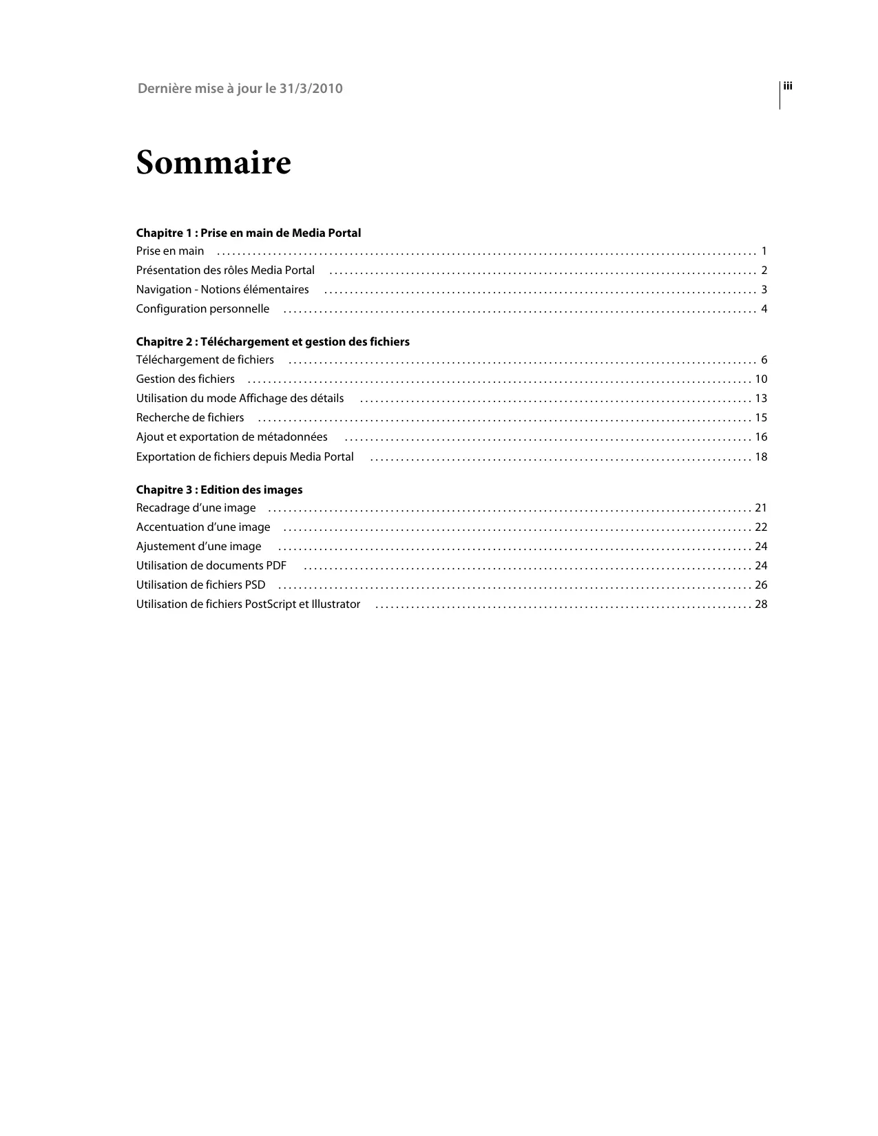 Utilisation d’ADOBE ® SCENE7® MEDIA PORTAL 4.4 Dernière mise à jour le 31/3/2010 © 2010 Adobe Systems Incorporated. All rights reserved. Copyright Utilisation d’Adobe® Scene7® Media Portal 4.4 This user guide is protected under copyright law, furnished for informational use only, is subject to change without notice, and should not be construed as a commitment by Adobe Systems Incorporated. Adobe Systems Incorporated assumes no responsibility or liability for any errors or inaccuracies that may appear in the informational content contained in this guide. This user guide is licensed for use under the terms of the Creative Commons Attribution Non-Commercial 3.0 License. This License allows users to copy, distribute, and transmit the user guide for noncommercial purposes only so long as (1) proper attribution to Adobe is given as the owner of the user guide; and (2) any reuse or distribution of the user guide contains a notice that use of the user guide is governed by these terms. The best way to provide notice is to include the following link. To view a copy of this license, visit http://creativecommons.org/licenses/by-nc-sa/3.0/ Adobe, the Adobe logo, and Scene7 are either registered trademarks or trademarks of Adobe Systems Incorporated in the United States and/or other countries. Mac is a trademark of Apple Inc., registered in the United States and other countries. Microsoft and Windows are either registered trademarks or trademarks of Microsoft Corporation in the United States and/or other countries. All other trademarks are the property of their respective owners. Updated Information/Additional Third Party Code Information available at http://www.adobe.com/go/thirdparty. Adobe Systems Incorporated, 345 Park Avenue, San Jose, California 95110, USA. Notice to U.S. Government end users: The Software and Documentation are “Commercial Items,” as that term is defined at 48 C.F.R. §2.101, consisting of “Commercial Computer Software” and “Commercial Computer Software Documentation,” as such terms are used in 48 C.F.R. §12.212 or 48 C.F.R. §227.7202, as applicable. Consistent with 48 C.F.R. §12.212 or 48 C.F.R. §§227.7202-1 through 227.7202-4, as applicable, the Commercial Computer Software and Commercial Computer Software Documentation are being licensed to U.S. Government end users (a) only as Commercial Items and (b) with only those rights as are granted to all other end users pursuant to the terms and conditions herein. Unpublished-rights reserved under the copyright laws of the United States. Adobe agrees to comply with all applicable equal opportunity laws including, if appropriate, the provisions of Executive Order 11246, as amended, Section 402 of the Vietnam Era Veterans Readjustment Assistance Act of 1974 (38 USC 4212), and Section 503 of the Rehabilitation Act of 1973, as amended, and the regulations at 41 CFR Parts 60-1 through 60-60, 60-250, and 60-741. The affirmative action clause and regulations contained in the preceding sentence shall be incorporated by reference. Dernière mise à jour le 31/3/2010 iii Sommaire