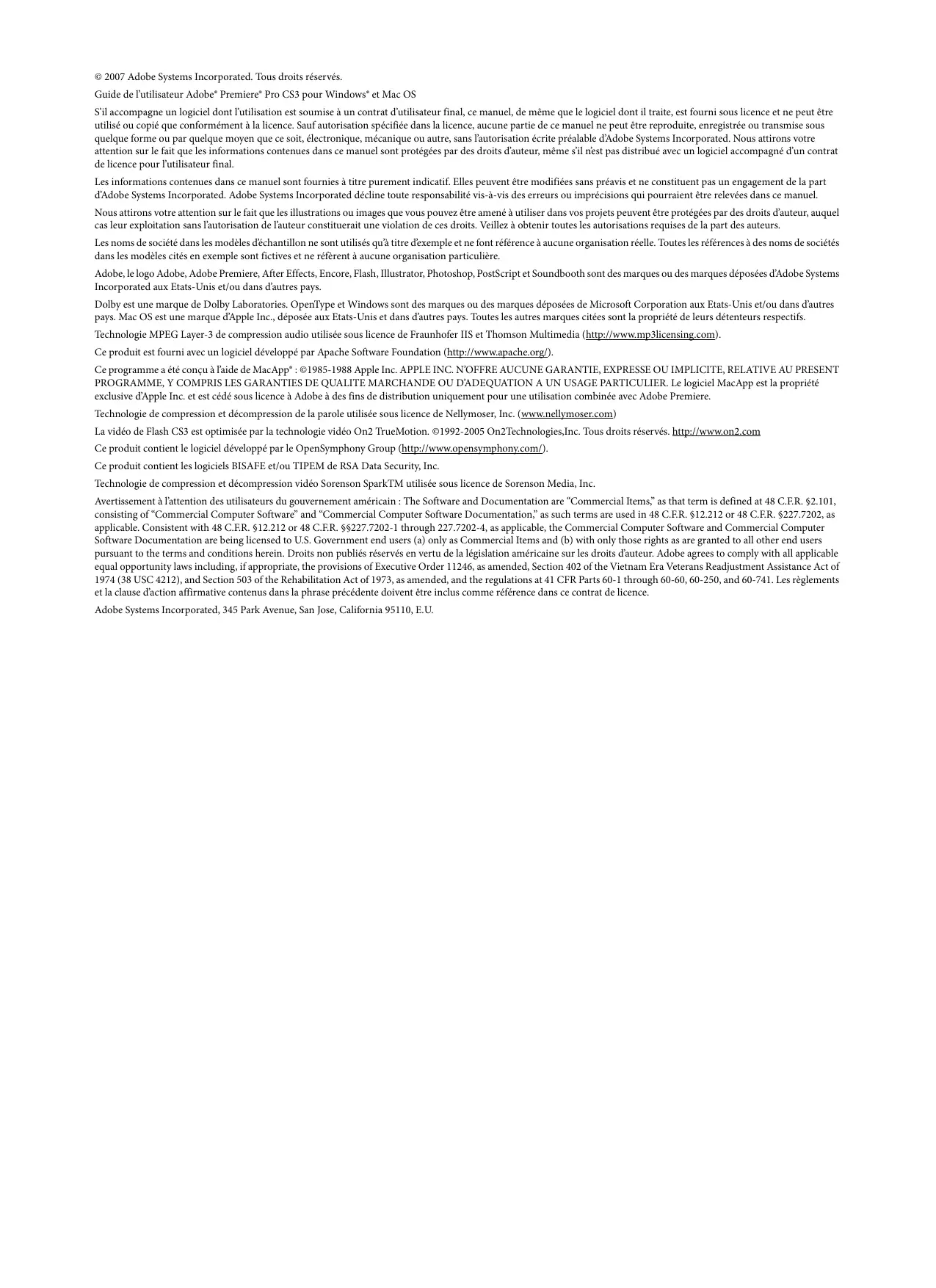 © 2007 Adobe Systems Incorporated. Tous droits réservés. Copyright Guide de l’utilisateur Adobe® Premiere® Pro CS3 pour Windows® et Mac OS S’il accompagne un logiciel dont l’utilisation est soumise à un contrat d’utilisateur final, ce manuel, de même que le logiciel dont il traite, est fourni sous licence et ne peut être utilisé ou copié que conformément à la licence. Sauf autorisation spécifiée dans la licence, aucune partie de ce manuel ne peut être reproduite, enregistrée ou transmise sous quelque forme ou par quelque moyen que ce soit, électronique, mécanique ou autre, sans l’autorisation écrite préalable d’Adobe Systems Incorporated. Nous attirons votre attention sur le fait que les informations contenues dans ce manuel sont protégées par des droits d’auteur, même s’il n’est pas distribué avec un logiciel accompagné d’un contrat de licence pour l’utilisateur final. Les informations contenues dans ce manuel sont fournies à titre purement indicatif. Elles peuvent être modifiées sans préavis et ne constituent pas un engagement de la part d’Adobe Systems Incorporated. Adobe Systems Incorporated décline toute responsabilité vis-à-vis des erreurs ou imprécisions qui pourraient être relevées dans ce manuel. Nous attirons votre attention sur le fait que les illustrations ou images que vous pouvez être amené à utiliser dans vos projets peuvent être protégées par des droits d’auteur, auquel cas leur exploitation sans l’autorisation de l’auteur constituerait une violation de ces droits. Veillez à obtenir toutes les autorisations requises de la part des auteurs. Les noms de société dans les modèles d’échantillon ne sont utilisés qu’à titre d’exemple et ne font référence à aucune organisation réelle. Toutes les références à des noms de sociétés dans les modèles cités en exemple sont fictives et ne réfèrent à aucune organisation particulière. Adobe, le logo Adobe, Adobe Premiere, After Effects, Encore, Flash, Illustrator, Photoshop, PostScript et Soundbooth sont des marques ou des marques déposées d’Adobe Systems Incorporated aux Etats-Unis et/ou dans d’autres pays. Dolby est une marque de Dolby Laboratories. OpenType et Windows sont des marques ou des marques déposées de Microsoft Corporation aux Etats-Unis et/ou dans d’autres pays. Mac OS est une marque d’Apple Inc., déposée aux Etats-Unis et dans d’autres pays. Toutes les autres marques citées sont la propriété de leurs détenteurs respectifs. Technologie MPEG Layer-3 de compression audio utilisée sous licence de Fraunhofer IIS et Thomson Multimedia (http://www.mp3licensing.com). Ce produit est fourni avec un logiciel développé par Apache Software Foundation (http://www.apache.org/). Ce programme a été conçu à l’aide de MacApp® : ©1985-1988 Apple Inc. APPLE INC. N’OFFRE AUCUNE GARANTIE, EXPRESSE OU IMPLICITE, RELATIVE AU PRESENT PROGRAMME, Y COMPRIS LES GARANTIES DE QUALITE MARCHANDE OU D’ADEQUATION A UN USAGE PARTICULIER. Le logiciel MacApp est la propriété exclusive d’Apple Inc. et est cédé sous licence à Adobe à des fins de distribution uniquement pour une utilisation combinée avec Adobe Premiere. Technologie de compression et décompression de la parole utilisée sous licence de Nellymoser, Inc. (www.nellymoser.com) La vidéo de Flash CS3 est optimisée par la technologie vidéo On2 TrueMotion. ©1992-2005 On2Technologies,Inc. Tous droits réservés. http://www.on2.com Ce produit contient le logiciel développé par le OpenSymphony Group (http://www.opensymphony.com/). Ce produit contient les logiciels BISAFE et/ou TIPEM de RSA Data Security, Inc. Technologie de compression et décompression vidéo Sorenson SparkTM utilisée sous licence de Sorenson Media, Inc. Avertissement à l’attention des utilisateurs du gouvernement américain : The Software and Documentation are “Commercial Items,” as that term is defined at 48 C.F.R. §2.101, consisting of “Commercial Computer Software” and “Commercial Computer Software Documentation,” as such terms are used in 48 C.F.R. §12.212 or 48 C.F.R. §227.7202, as applicable. Consistent with 48 C.F.R. §12.212 or 48 C.F.R. §§227.7202-1 through 227.7202-4, as applicable, the Commercial Computer Software and Commercial Computer Software Documentation are being licensed to U.S. Government end users (a) only as Commercial Items and (b) with only those rights as are granted to all other end users pursuant to the terms and conditions herein. Droits non publiés réservés en vertu de la législation américaine sur les droits d’auteur. Adobe agrees to comply with all applicable equal opportunity laws including, if appropriate, the provisions of Executive Order 11246, as amended, Section 402 of the Vietnam Era Veterans Readjustment Assistance Act of 1974 (38 USC 4212), and Section 503 of the Rehabilitation Act of 1973, as amended, and the regulations at 41 CFR Parts 60-1 through 60-60, 60-250, and 60-741. Les règlements et la clause d’action affirmative contenus dans la phrase précédente doivent être inclus comme référence dans ce contrat de licence. Adobe Systems Incorporated, 345 Park Avenue, San Jose, California 95110, E.U. iii Sommaire