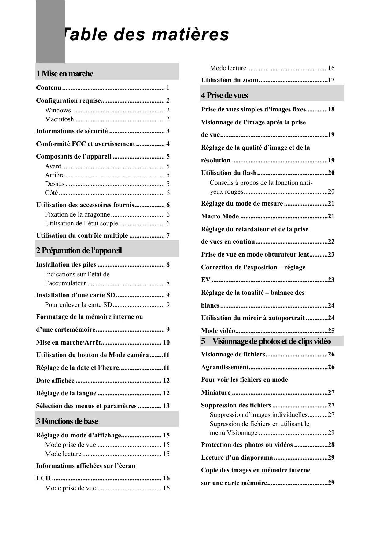 - Aide 1 Mise en marche Contenu Veuillez contacter votre revendeur immédiatement si des éléments sont absents ou endommagés. Câble USB Appareil 2 piles AA Etui souple Guide de l’utilsateur Dragonne CD-ROM d’installation du logiciel (y compris un guide de l’utilisateur multilingue) p. 53