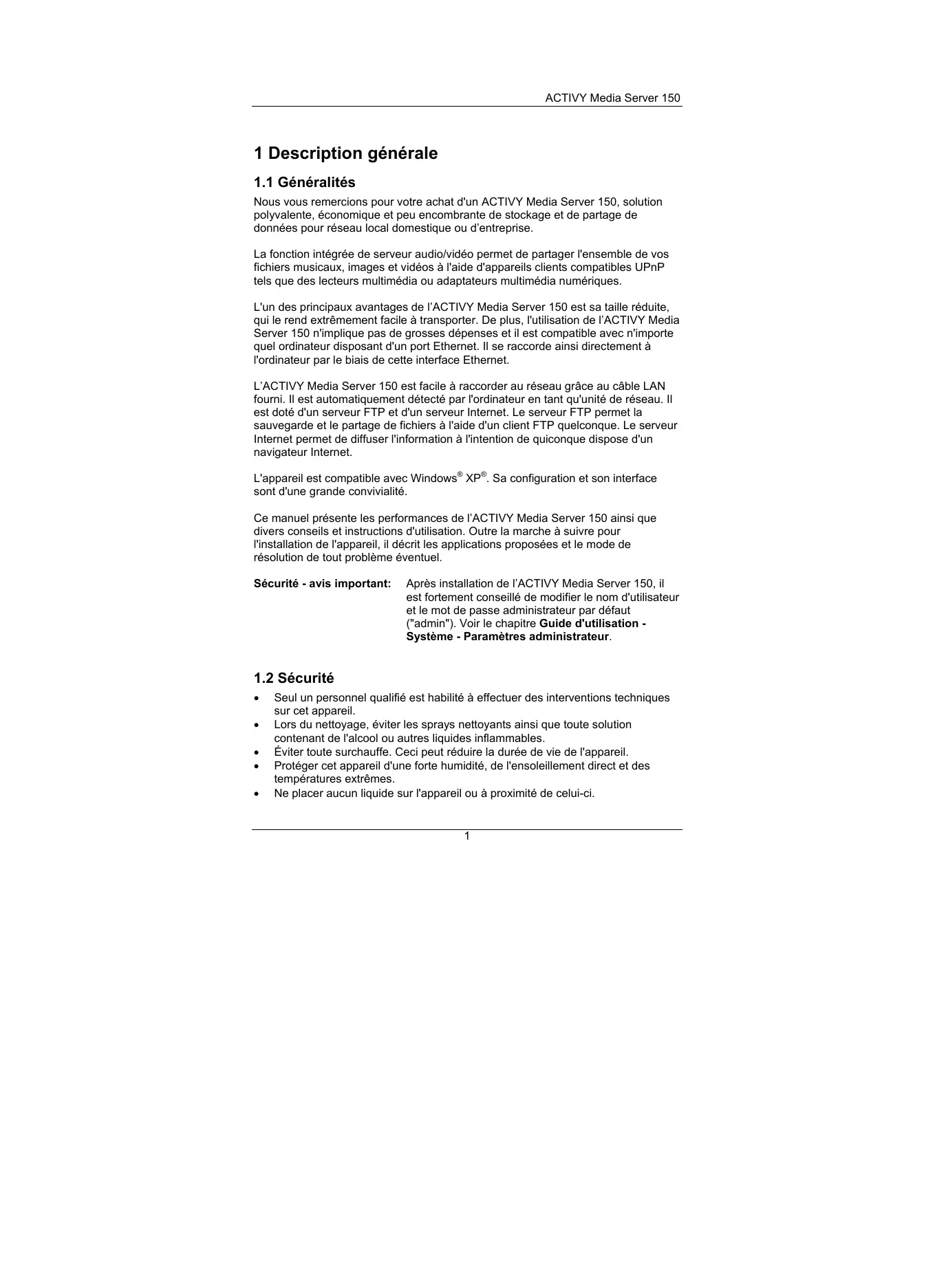 L'appareil est compatible avec Windows XP . Sa configuration et son interface sont d'une grande convivialité. Ce manuel présente les performances de l’ACTIVY Media Server 150 ainsi que divers conseils et instructions d'utilisation. Outre la marche à suivre pour l'installation de l'appareil, il décrit les applications proposées et le mode de résolution de tout problème éventuel. Sécurité - avis important: Après installation de l’ACTIVY Media Server 150, il est fortement conseillé de modifier le nom d'utilisateur et le mot de passe administrateur par défaut ("admin"). Voir le chapitre Guide d'utilisation Système - Paramètres administrateur.