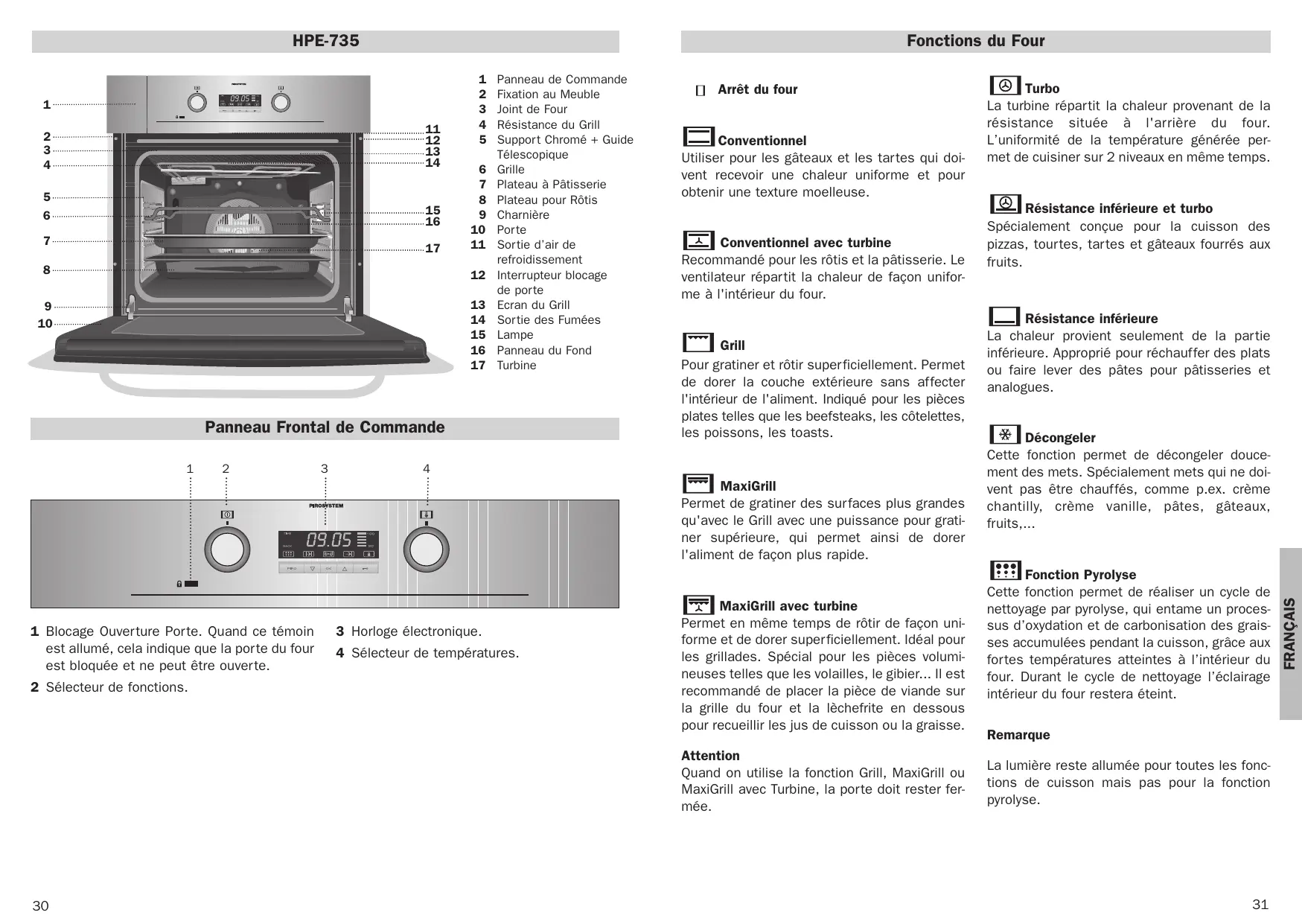 à nouveau sur l’écran de l’horloge. 10 Appuyez sur n’importe quel symbole de l’horloge pour arrêter le signal sonore. 11 Placez le sélecteur de fonction de cuisson sur la position . 12 Le processus de chauffage du four terminé, le four reste cependant très chaud et ne peut être utilisé. Jusqu’à ce que le four refroidisse vous observez que le moteur de refroidissement continue à fonctionner, le pilote reste éclairé et le symbole clignote sur l’écran de l’horloge. IMPORTANT En raison des fortes températures à l’intérieur du four, le processus de refroidissement peut durer jusqu’à 2 heures. 13 Une fois que votre four a refroidi, le témoin s’éteint. 14 Appuyez sur la touche PIRO pour que le symbole cesse de clignoter. IMPORTANT Pour débloquer la porte (témoin allumé), le sélecteur de fonctions doit se trouver sur la position . Si vous n’aviez pas suivi la consigne 11, mettez le sélecteur de fonctions sur la position maintenant et attendez quelques minutes jusqu’à ce que la porte se débloque et que le témoin s’éteigne. 15 Ouvrez la porte du four et passez un chiffon humide à l’intérieur de la cavité, afin de retirer la cendre obtenue pendant le cycle de nettoyage. Dans les coins difficiles d’accès à l’intérieur du four, il sera nécessaire d’utiliser une éponge en fibre non métallique. 16 Une fois l’intérieur du four propre, n’oubliez pas de remettre les supports et les ustensiles. 17 Le four est prêt pour une prochaine utilisation. IMPORTANT : Si vous repérez un quelconque problème dans la programmation et l’utilisation de cette fonction, reportez-vous au chapitre « Problèmes dans l'utilisation de la fonction pyrolyse ». 35