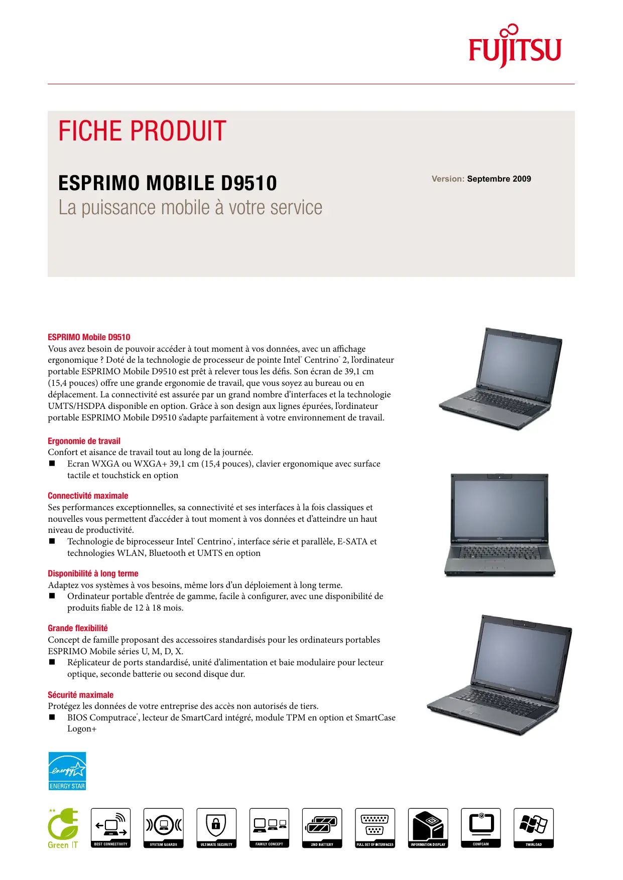 Utilitaire de réglage du ventilateur Utilitaire d’économie d’énergie Support de restauration Windows Vista® DVD de pilotes et utilitaires (DUDVD) Gestionnaire de connexions UMTS (en option avec UMTS) Logiciel de lecture de DVD Gestion des pilotes DeskUpdate DeskView Migrate (en option) DeskView Control (en option) Gestion de clients DeskView 10.x incluant : Gestion de clients à distance en ligne/hors ligne Gestion et rapports détaillés sur l’inventaire système Gestion du BIOS Gestion de l’alimentation à distance Notifications système Contrôle à distance de la sécurité Intégration Helpdesk DeskView Fonction WoL (wake on LAN) PXE BootP (made4you) WMI http://ts.fujitsu.com/solutions/it_infrastructure_solutions/manageability/featurefinder.html Prise en charge du verrou Kensington En option : module de plate-forme sécurisée (TPM 1.2) Symantec Norton Internet Security (version d’évaluation de 90 jours) Mot de passe pour le disque dur Mot de passe BIOS pour les utilisateurs et les superviseurs Logement pour carte à puce (SmartCard) séparé Sécurité SystemLock 2 BIOS avec carte à puce Lecteur d’empreintes digitales intégré (pour les projets uniquement) GS CE CE! FCC classe B (selon configuration sans fil) UL cUL RoHS (limitation d’utilisation des substances dangereuses) DEEE (Déchets d’équipements électriques et électroniques) Certification ENERGY STAR® 4.0 3 ans de service sur site Disponibilité des pièces de rechange 5 ans Service Weblink http://fr.ts.fujitsu.com/Supportservice