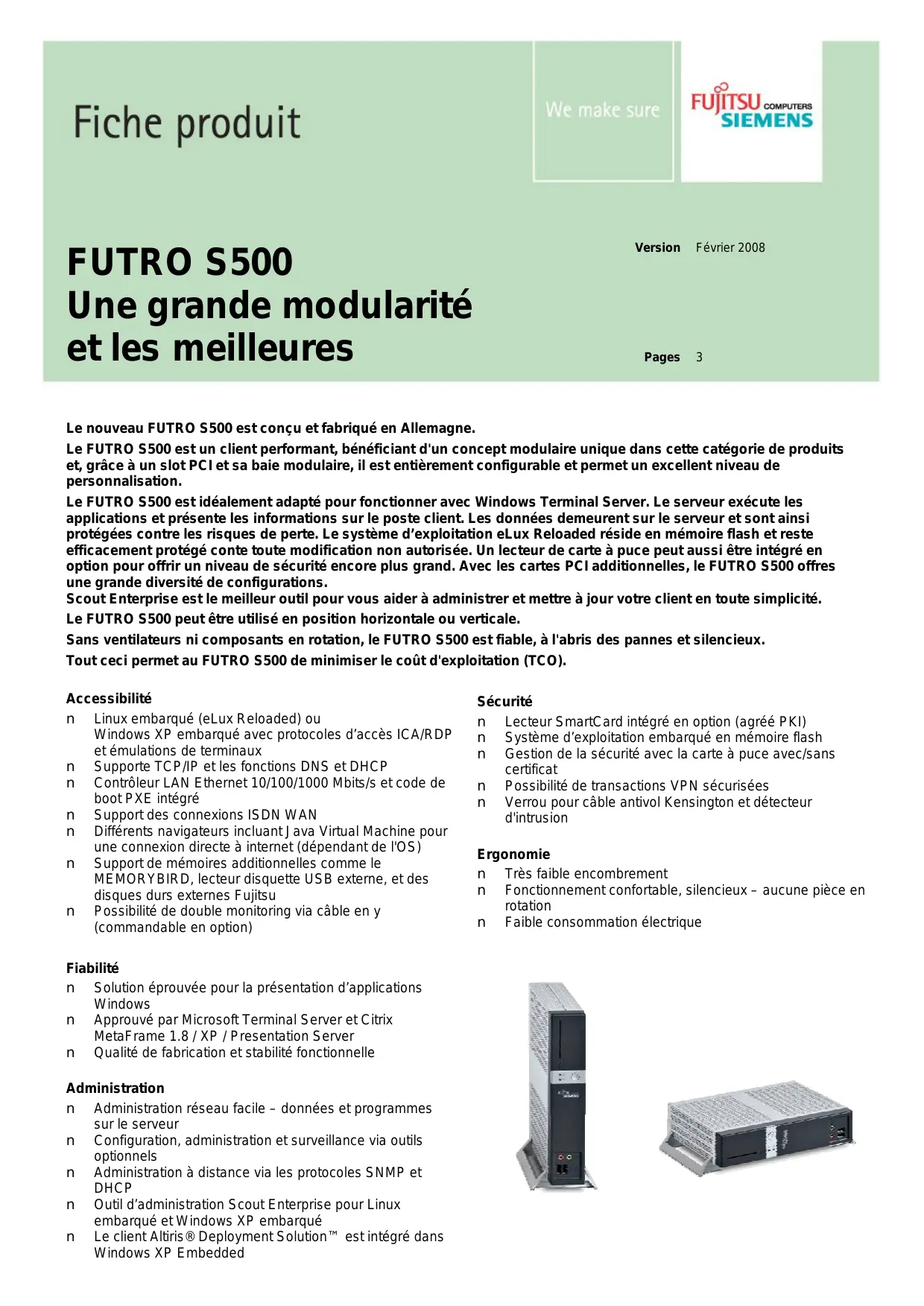 Le FUTRO S500 est idéalement adapté pour fonctionner avec Windows Terminal Server. Le serveur exécute les applications et présente les informations sur le poste client. Les données demeurent sur le serveur et sont ainsi protégées contre les risques de perte. Le système d’exploitation eLux Reloaded réside en mémoire flash et reste efficacement protégé conte toute modification non autorisée. Un lecteur de carte à puce peut aussi être intégré en option pour offrir un niveau de sécurité encore plus grand. Avec les cartes PCI additionnelles, le FUTRO S500 offres une grande diversité de configurations. Scout Enterprise est le meilleur outil pour vous aider à administrer et mettre à jour votre client en toute simplicité. Le FUTRO S500 peut être utilisé en position horizontale ou verticale. Sans ventilateurs ni composants en rotation, le FUTRO S500 est fiable, à l'abris des pannes et silencieux. Tout ceci permet au FUTRO S500 de minimiser le coût d'exploitation (TCO). Accessibilité n Linux embarqué (eLux Reloaded) ou Windows XP embarqué avec protocoles d’accès ICA/RDP et émulations de terminaux n Supporte TCP/IP et les fonctions DNS et DHCP n Contrôleur LAN Ethernet 10/100/1000 Mbits/s et code de boot PXE intégré n Support des connexions ISDN WAN n Différents navigateurs incluant Java Virtual Machine pour une connexion directe à internet (dépendant de l'OS) n Support de mémoires additionnelles comme le MEMORYBIRD, lecteur disquette USB externe, et des disques durs externes Fujitsu n Possibilité de double monitoring via câble en y (commandable en option) Fiabilité n Solution éprouvée pour la présentation d’applications Windows n Approuvé par Microsoft Terminal Server et Citrix MetaFrame 1.8 / XP / Presentation Server n Qualité de fabrication et stabilité fonctionnelle Administration n Administration réseau facile – données et programmes sur le serveur n Configuration, administration et surveillance via outils optionnels n Administration à distance via les protocoles SNMP et DHCP n Outil d’administration Scout Enterprise pour Linux embarqué et Windows XP embarqué n Le client Altiris® Deployment Solution™ est intégré dans Windows XP Embedded