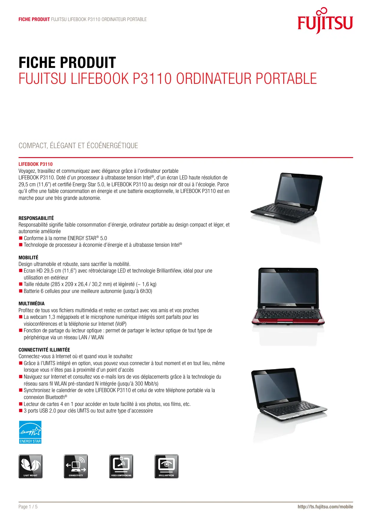 Voyagez, travailliez et communique avec élegance grâce à l'ordinateur portable LIFEBOOK P3110. Doté d'un processeur à ultrabasse tension Intel®, d'un écran LED haute résolution de 29,5 cm (11,6") et certifié Energy Star 5.0, le LIFEBOOK P3110 au design noir dit où à l'écologie. Parce qu'il offre une faible consommation en énergie et une batterie exceptionnelle, le LIFEBOOK P3110 est en marche pour une très grande autonomie.