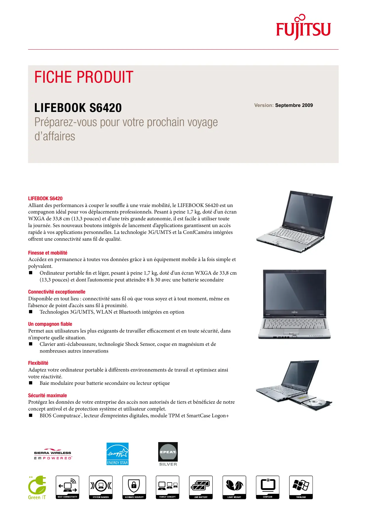 DeskView Migrate (en option) DeskView Control (en option) Gestion du BIOS Gestion de l’alimentation à distance Notifications système Contrôle à distance de la sécurité Intégration Helpdesk DeskView Fonction WoL (wake on LAN) WMI PXE BootP (made4you) http://ts.fujitsu.com/solutions/it_infrastructure_solutions/manageability/featurefinder.html Prise en charge du verrou Kensington BIOS Computrace® En option : module de plate-forme sécurisée (TPM 1.2) Symantec Norton Internet Security (version d’évaluation de 90 jours) Lecteur d’empreintes digitales intégré Contrôleur de carte à puce (SmartCard) intégré dans la carte PC Card avec prise en charge du verrouillage système Mot de passe pour le disque dur Sécurité SystemLock BIOS avec carte à puce SmartCase Logon+ inclus Logiciel de lecture d’empreintes digitales Mot de passe BIOS pour les utilisateurs et les superviseurs CE CE! FCC classe B (selon configuration sans fil) CSA cUL UL RoHS (limitation d’utilisation des substances dangereuses) DEEE (Déchets d’équipements électriques et électroniques) Systèmes d’exploitation Microsoft (HCT / entrée HCL / WHQL) 3 ans de service sur site Disponibilité des pièces de rechange 5 ans Service Weblink http://fr.ts.fujitsu.com/Supportservice