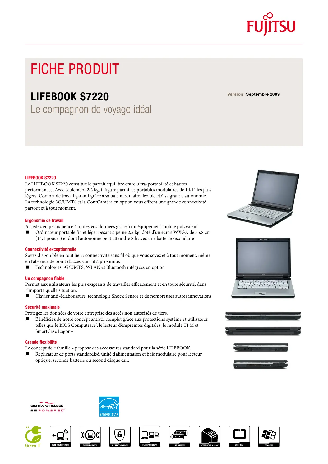 Reprise et recyclage : http://fr.ts.fujitsu.com/recycling Tous droits réservés, y compris tous les droits de propriété intellectuelle. Modifications Publié par apportées aux données techniques réservées. L’offre et la livraison des produits sont soumises Fujitsu Technology Solutions à leur disponibilité. Toute responsabilité quant à l’exhaustivité, à l’exactitude et/ou au caractère http://ts.fujitsu.com réel des données et des illustrations est exclue. Ces désignations peuvent être des marques commerciales et/ou des copyrights du fabricant respectif ; leur utilisation par des tiers pour leur propre bénéfice peut entraîner une violation des droits des propriétaires de ces marques commerciales ou de ces copyrights. Pour plus d’informations, visitez le site : http://fr.ts.fujitsu.com/terms_of_use.html Copyright © Fujitsu Technology Solutions Septembre 2009