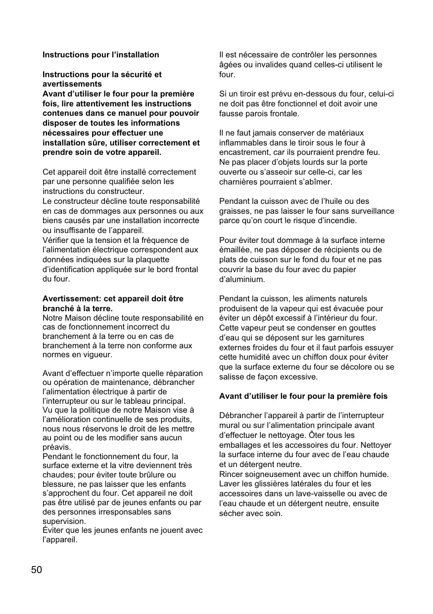 Instructions pour l’installation Instructions pour la sécurité et avertissements Avant d’utiliser le four pour la première fois, lire attentivement les instructions contenues dans ce manuel pour pouvoir disposer de toutes les informations nécessaires pour effectuer une installation sûre, utiliser correctement et prendre soin de votre appareil. Cet appareil doit être installé correctement par une personne qualifiée selon les instructions du constructeur. Le constructeur décline toute responsabilité en cas de dommages aux personnes ou aux biens causés par une installation incorrecte ou insuffisante de l’appareil. Vérifier que la tension et la fréquence de l’alimentation électrique correspondent aux données indiquées sur la plaquette d’identification appliquée sur le bord frontal du four.