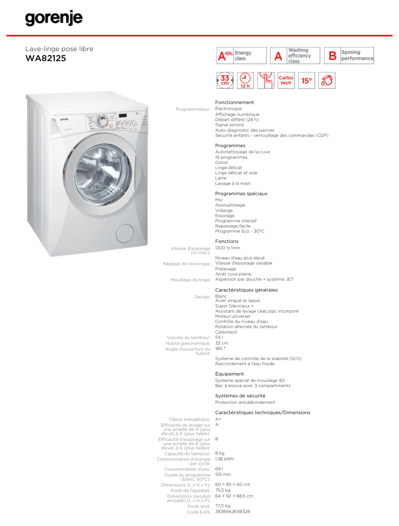 Retrouvez gratuitement la notice de l'appareil WA82125 GORENJE au format PDF.