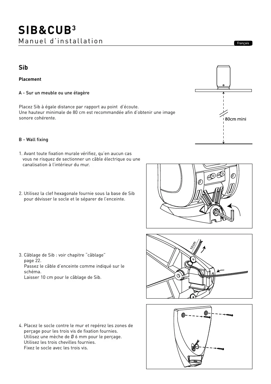 3. Câblage de Sib : voir chapitre “câblage” page 22. Passez le câble d’enceinte comme indiqué sur le schéma. Laisser 10 cm pour le câblage de Sib.