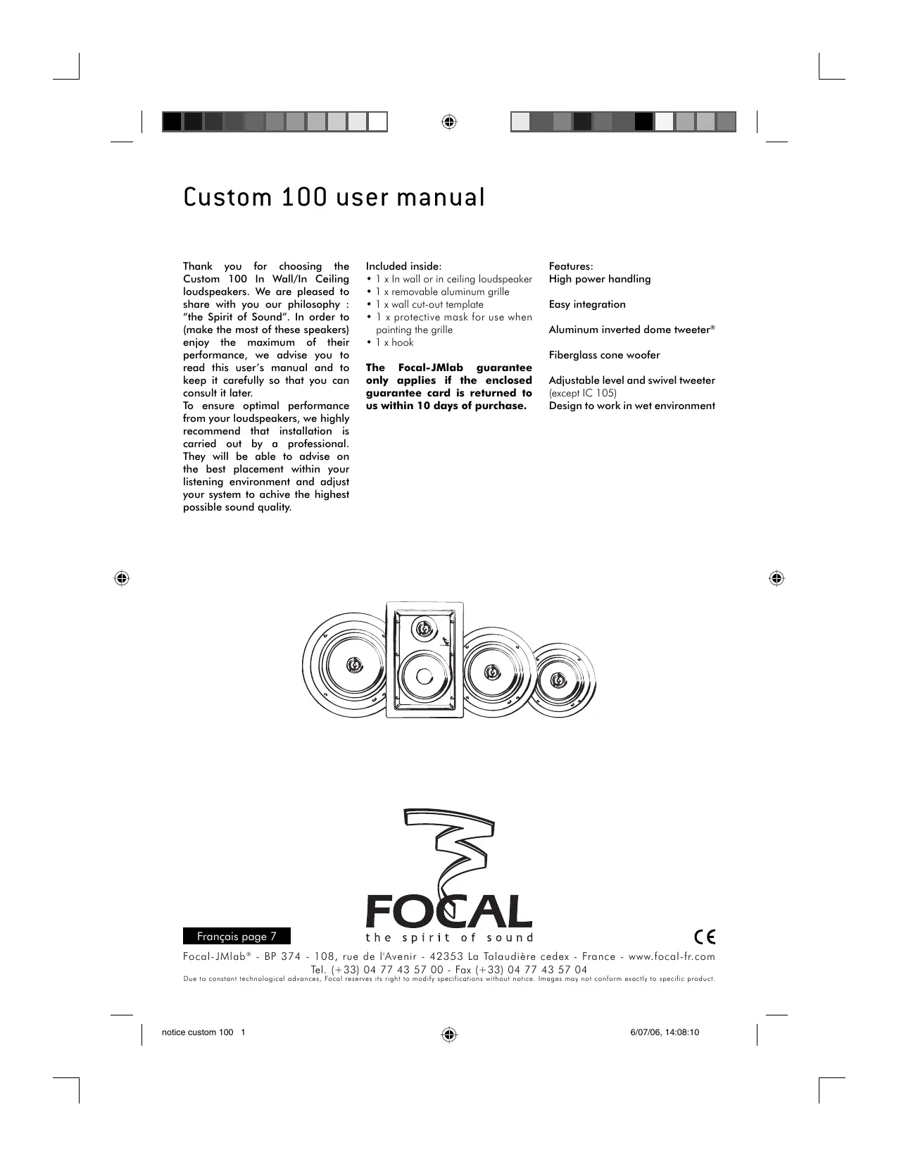 Nous vous remercions d'avoir choisi les enceintes encastrables de la ligne Custom 100 et de partirger avec nous notre philosophie "the Spirit of Sound". Afin d'exploiter toutes leurs performances, nous vous conseillons de dire les instructions de ce livre puis de le conserver avec précaution pour vous y reférer ultérieurement.