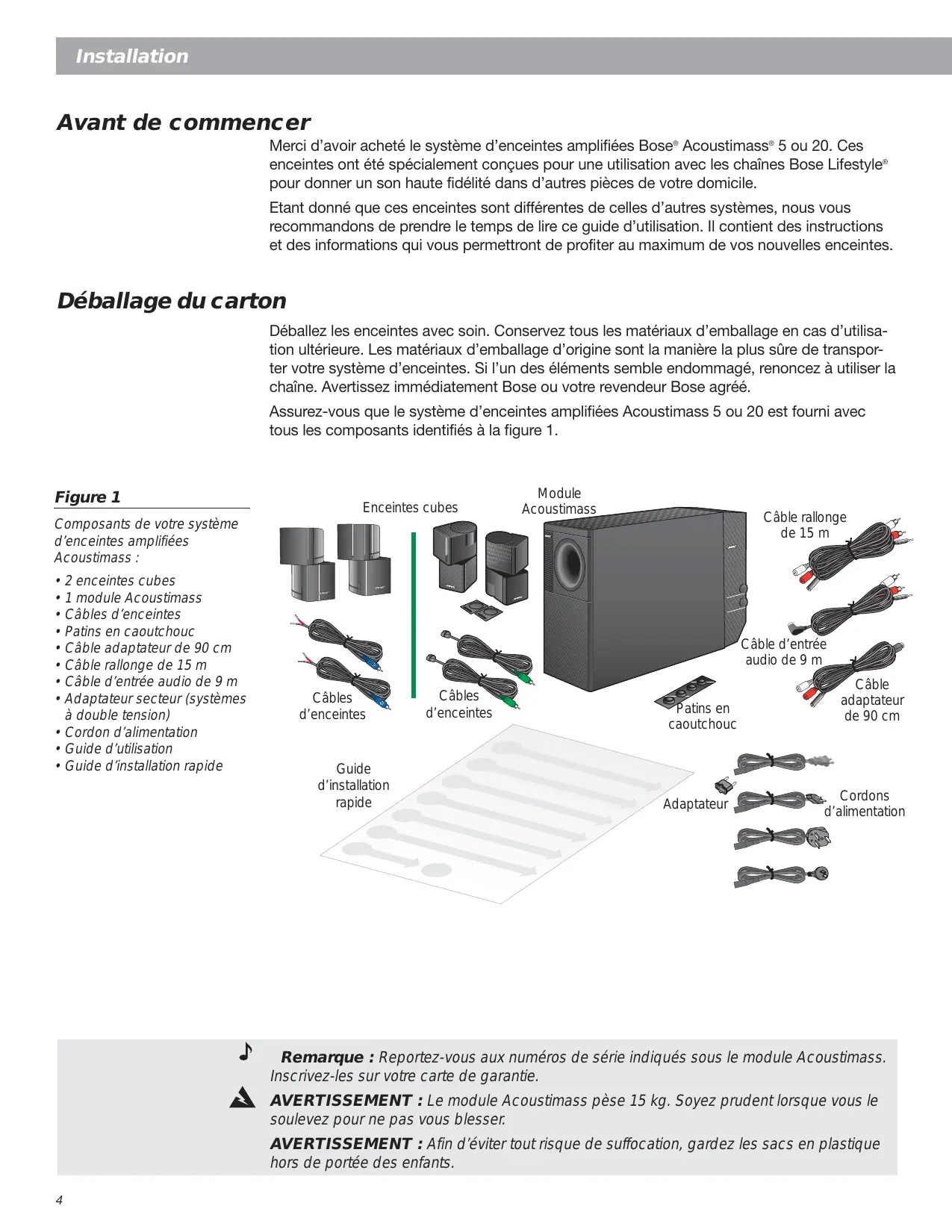 Installation Avant de commencer Merci d’avoir acheté le système d’enceintes amplifiées Bose® Acoustimass® 5 ou 20. Ces enceintes ont été spécialement conçues pour une utilisation avec les chaînes Bose Lifestyle® pour donner un son haute fidélité dans d’autres pièces de votre domicile. Etant donné que ces enceintes sont différentes de celles d’autres systèmes, nous vous recommandons de prendre le temps de lire ce guide d’utilisation. Il contient des instructions et des informations qui vous permettront de profiter au maximum de vos nouvelles enceintes. Déballage du carton Déballez les enceintes avec soin. Conservez tous les matériaux d’emballage en cas d’utilisation ultérieure. Les matériaux d’emballage d’origine sont la manière la plus sûre de transporter votre système d’enceintes. Si l’un des éléments semble endommagé, renoncez à utiliser la chaîne. Avertissez immédiatement Bose ou votre revendeur Bose agréé. Assurez-vous que le système d’enceintes amplifiées Acoustimass 5 ou 20 est fourni avec tous les composants identifiés à la figure 1. Figure 1 Enceintes cubes Module Acoustimass Câble rallonge de 15 m Composants de votre système d’enceintes amplifiées Acoustimass :