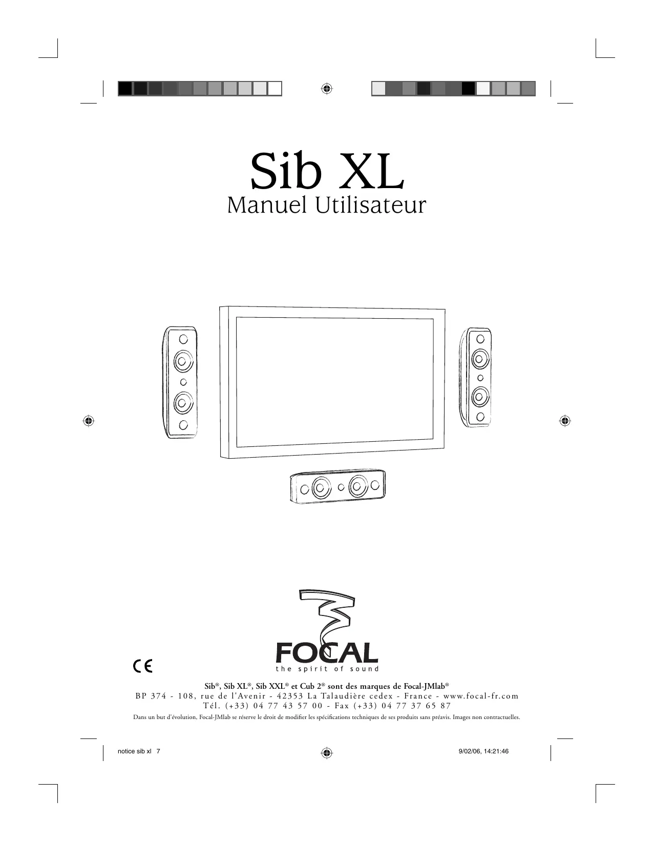 Specifications Description 2-way "On wall" LCR bass reflex loudspeaker Woofer Tweeter two 5" Polyflex cone 3/4" OAL aluminum dome Frequency response (+/-3dB) 67Hz - 35kHz Sensitivity (2.83 V/1 m) 91dB Power handling 100W Crossover OPC 12dB/oct, 3.5kHz Nominale/minimum impedance 8ohms/3.6ohms @ 250Hz Dimensions (HxWxD) 19-7/8x5-1/2x4-1/4" (505x142x108mm) Net weight 8.8lbs (4.0kg) User precautions Maintenance is easy and consists only in cleaning the covering with a dry cloth. If the enclosure is stained, we simply recommend the use of a damp cloth. Never use any solvents, detergents, alcohol or corrosive products, scrappers or scouring powder to clean the surface of the loudspeaker. Avoid placing the loudspeakers near a heat source. Conditions of garantee All Focal loudspeakers are covered by guarantee drawn up by the official Focal-JMlab distributor in your country. Your distributor can provide all details concerning the conditions of guarantee. Guarantee cover extends at least to that granted by the legal guarantee in force in the country where the original purchase invoice was issued. Your Focal-JMlab product was developed and manufactured with high-quality materials and components which can be recycled and/or re-used. This symbol indicates that electrical and electronic equipment must be disposed of separately from normal garbage at the end of its operational lifetime.Please dispose of this product by bringing it to your local collection point or recycling centre for such equipment. This will help to protect the environment in which we all live. notice sib xl 6 9/02/06, 14:21:45 Sib Manuel Utilisateur Sib®, Sib XL®, Sib XXL® et Cub 2® sont des marques de Focal-JMlab® B P 3 7 4 - 1 0 8 , r u e d e l ' Av e n i r - 4 2 3 5 3 L a Ta l a u d i è r e c e d e x - Fr a n c e - w w w. f o c a l - f r. c o m T é l . ( + 3 3 ) 0 4 7 7 4 3 5 7 0 0 - Fa x ( + 3 3 ) 0 4 7 7 3 7 6 5 8 7 Dans un but d'évolution, Focal-JMlab se réserve le droit de modifier les spécifications techniques de ses produits sans préavis. Images non contractuelles. notice sib xl 7 9/02/06, 14:21:46 Français Sib XL : manuel de l’utilisateur Nous vous remercions d’avoir choisi les enceintes Sib XL et de partager avec nous notre philosophie "the Spirit of Sound". Sib XL a été spécialement conçu pour s’accrocher au mur et s’harmoniser avec les écrans plats Plasma ou LCD muraux. Sib XL s’inscrit en plein dans la tradition Focal et bénéficie à ce titre d’une expertise technologique incomparable pour la stéréo ou le home cinéma. Afin d’exploiter le maximum de ses performances, nous vous conseillons de lire les instructions de ce livret puis de le conserver avec précaution pour vous y référer ultérieurement. Caractéristiques Tweeter à dôme aluminium OAL (Optimum Acoustic Loading) : bande passante étendue à 35 kHz pour des aigus fins, dynamiques, non directifs et compatibles avec les sources audio très hautes performances ou multicanaux. Woofers Polyflex® : membrane synthétique hautes performances pour un grave rapide et un médium riche. Filtre OPC® (Optimum Phase Crossover) : pour une image sonore précise, stable et naturelle. Utilisation verticale / horizontal ou sur pied : grâce à la plaque de fixation Polyfix, Sib XL peut se fixer au mur en vertical ou en horizontal, ou sur pied optionnel. Mode "On wall / Freestanding" : ce commutateur à deux positions optimise la courbe de réponse selon que l’enceinte est directement fixée au mur ou posée sur le pied optionnel Hop ou Bop. Logo orientable : pour utilisation verticale ou horizontale de Sib XL Construction en ABS : enceinte rigide, absence de résonance. Double évent bass-reflex aérodynamique : grave puissant sans distorsion. Blindage magnétique : Sib XL est conçu pour être placé à proximité d’un téléviseur, sans endommager celui-ci. Étanche aux projections d’eau : peut être utilisé en milieu humide dans une salle de bain ou une cuisine. Rodage Les haut-parleurs sont des éléments mécaniques complexes qui exigent un rodage pour fonctionner au mieux de leurs possibilités et s’adapter aux conditions de température et d’humidité de votre environnement. Cette période de rodage varie selon les conditions rencontrées et peut se prolonger sur quelques semaines. Pour accélérer cette opération, nous vous conseillons de faire fonctionner vos enceintes une vingtaine d’heures à niveau moyen, sur des programmes musicaux variés mais chargés en grave. Une fois les caractéristiques de l’enceinte totalement stabilisées, vous pourrez profiter intégralement des performances de vos enceintes. Pour validation de la garantie Focal-JMlab, merci de nous retourner la garantie jointe dans les 10 jours. notice sib xl 8 9/02/06, 14:21:46