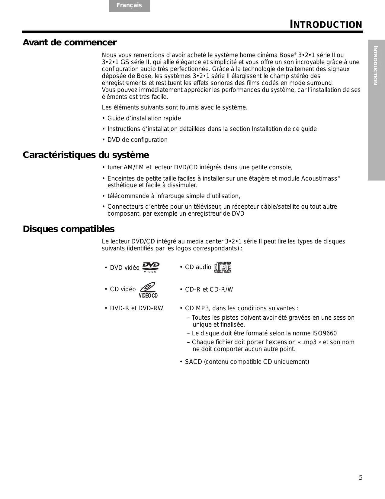 English Español Français INTRODUCTION Titre : Contenu d’un DVD, qui peut inclure d’autres éléments que le film en lui-même. Vidéo composante : Signal vidéo divisé en trois parties : un signal de luminance et deux signaux de couleurs (désignés par YPbPr). Il permet d’obtenir la meilleure qualité d’image en termes de résolution, mais ne peut pas être traité par tous les téléviseurs. Vidéo composite : Signal vidéo unique contenant les informations de luminance, de couleur et de synchronisation. Les systèmes NTSC et PAL sont des exemples de systèmes vidéo composite. Garantie limitée Les systèmes home cinéma 3•2•1 série II et 3•2•1 GS série II sont couverts par une garantie limitée transférable. Les conditions détaillées de la garantie limitée sont notées sur la carte d’enregistrement qui accompagne votre système. Remplissez la section « Informations » de la carte et renvoyez-la par courrier à Bose. En cas d’oubli, les droits que vous confère cette garantie limitée ne s’en trouveront pas affectés. Renseignements à conserver Les numéros de série se situent au-dessous du media center et à l’arrière du module Acoustimass®. Munissez-vous toujours de vos numéros de série avant de contacter le Service client de Bose®. Modèle : 3•2•1 série II 3•2•1 GS série II Cochez la case appropriée. Numéro de série du media center : ___________________________________________________ Numéro de série du module Acoustimass : ____________________________________________ Nom du revendeur : ________________________________________________________________ Téléphone du revendeur : ______________________ Date d’achat : ________________________ Nous vous conseillons de conserver votre reçu et votre carte d’enregistrement avec cette notice d’utilisation. ©2005 Bose Corporation. Toute reproduction, modification, distribution ou autre utilisation, même partielle, de ce document est interdite sans autorisation écrite préalable. Dolby et le symbole du double D sont des marques de commerce de Dolby Laboratories. Fabriqué sous licence de Dolby Laboratories. Ouvrage non publié à caractère confidentiel. 1992-1997 Dolby Laboratories. Tous droits réservés. Ce produit intègre une technologie de défense des droits d’auteurs protégée par les revendications de procédés de certains brevets américains et autres droits de propriété intellectuelle détenus par Macrovision Corporation et autres titulaires de ces droits. L’utilisation de ladite technologie doit être autorisée par Macrovision Corporation. Elle est consentie pour le seul usage domestique et certains autres usages limités de visionnage, sauf autorisation contraire de Macrovision Corporation. Tout désassemblage ou démontage est interdit. « DTS » et « DTS Digital Surround » sont des marques déposées de Digital Theater Systems, Inc. La technologie de compression audio MPEG Layer-3 est sous licence de Fraunhofer IIS et THOMSON Multimedia. Ce produit intègre une technologie de défense des droits d’auteurs et d’autres droits de propriété intellectuelle détenus par Cirrus Logic, Inc. Il est soumis aux lois de protection des droits d’auteurs des Etats-Unis ainsi qu’à d’autres restrictions et protections d’octroi de licence. L’utilisation de ladite technologie se limite uniquement à l’utilisation des circuits intégrés Cirrus Logic intégrés à ce produit. Tout désassemblage ou démontage est interdit.