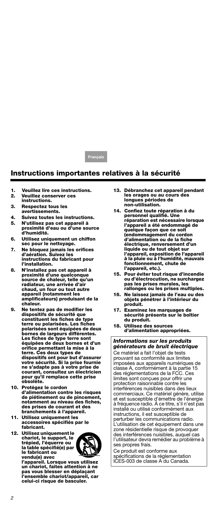 chariot, le support, le trépied, l’équerre ou la table spécifié(e) par le fabricant ou vendu(e) avec l’appareil. Lorsque vous utilisez un chariot, faites attention à ne pas vous blesser en déplaçant l’ensemble chariot/appareil, car celui-ci risque de basculer.