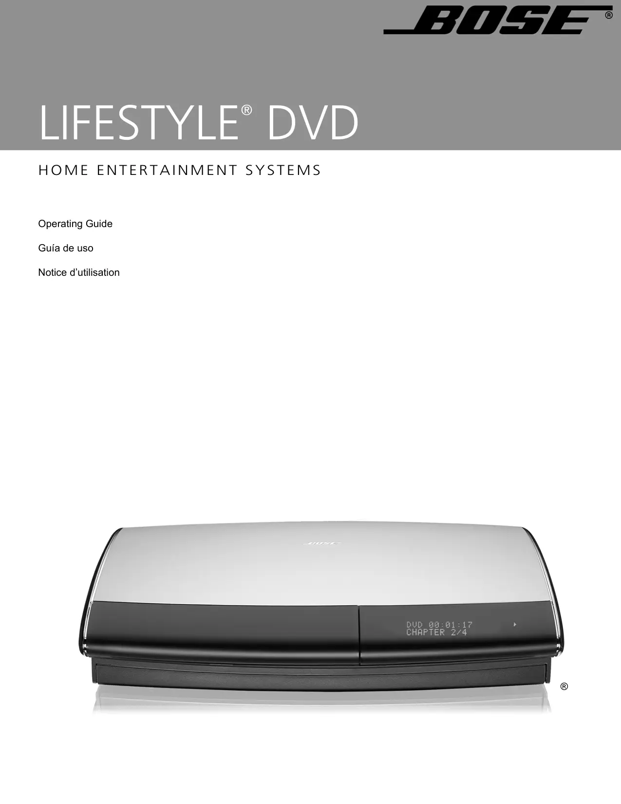 Vous trouverez des instructions complémentaires dans le document intitulé Informations de sécurité importantes joint au carton d’expédition. ©2005 Bose Corporation. Toute reproduction, modification, distribution ou autre utilisation, même partielle, de ce document est interdite sans autorisation écrite préalable. Dolby et le symbole du double D sont des marques de commerce de Dolby Laboratories. Fabriqué sous licence de Dolby Laboratories. Ouvrage non publié à caractère confidentiel. ! 1992-1997 Dolby Laboratories. Tous droits réservés. Ce produit contient un ou plusieurs programmes protégés par les lois internationales et américaines (États-Unis) de protection des droits d’auteurs en tant que produits non publiés. Ils sont confidentiels et sont la propriété de Dolby Laboratories. Leur reproduction ou divulgation, en tout ou en partie, ou la production de programmes dérivés sans l’autorisation expresse de Dolby Laboratories est interdite. Copyright 1992-1996, Dolby Laboratories, Inc. Tous droits réservés. « DTS » et « DTS Digital Surround » sont des marques déposées de Digital Theater Systems, Inc. La technologie de compression audio MPEG Layer-3 est sous licence de Fraunhofer IIS et THOMSON Multimedia. Ce produit intègre une technologie de défense des droits d’auteurs protégée par les revendications de procédés de certains brevets américains et autres droits de propriété intellectuelle détenus par Macrovision Corporation et autres titulaires de ces droits. L’utilisation de ladite technologie doit être autorisée par Macrovision Corporation. Elle est consentie pour le seul usage domestique et certains autres usages limités de visionnage, sauf autorisation contraire de Macrovision Corporation. Tout désassemblage ou démontage est interdit. Ce produit intègre une technologie de défense des droits d’auteurs et d’autres droits de propriété intellectuelle détenus par Cirrus Logic, Inc. Il est soumis aux lois de protection des droits d’auteurs des Etats-Unis ainsi qu’à d’autres restrictions et protections d’octroi de licence. L’utilisation de ladite technologie se limite uniquement à l’utilisation des circuits intégrés Cirrus Logic intégrés à ce produit. Tout désassemblage ou démontage est interdit. Les consommateurs doivent avoir conscience du fait que les téléviseurs haute définition ne sont pas tous entièrement compatibles avec ce produit, ce qui peut provoquer l’affichage de parasites dans l’image. Pour les problèmes d’image en balayage progressif sur 525 lignes, il est recommandé d’utiliser le connecteur de sortie en définition standard. Pour les questions relatives à la compatibilité des téléviseurs avec ce modèle de lecteur DVD 525p, veuillez contacter notre service clientèle. Conçu avec la technologie UEI™ sous licence de Universal Electronics Inc. © UEI 2000-2002.