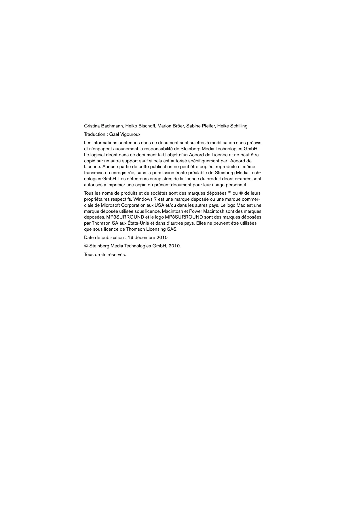 Das Audiomaterial wird exportiert und am festgelegten Speicherort abgelegt und auf eine neue Audiospur in Ihrem Projekt importiert. Schalten Sie die Solo-Funktion für die Mixdown-Spur ein, um zu überprüfen, ob der Audio-Mixdown so klingt, wie Sie es wünschen. 61 — Mischen und Anwenden von Effekten FRANÇAIS Français Cristina Bachmann, Heiko Bischoff, Marion Bröer, Sabine Pfeifer, Heike Schilling Traduction : Gaël Vigouroux Les informations contenues dans ce document sont sujettes à modification sans préavis et n’engagent aucunement la responsabilité de Steinberg Media Technologies GmbH. Le logiciel décrit dans ce document fait l’objet d’un Accord de Licence et ne peut être copié sur un autre support sauf si cela est autorisé spécifiquement par l’Accord de Licence. Aucune partie de cette publication ne peut être copiée, reproduite ni même transmise ou enregistrée, sans la permission écrite préalable de Steinberg Media Technologies GmbH. Les détenteurs enregistrés de la licence du produit décrit ci-après sont autorisés à imprimer une copie du présent document pour leur usage personnel. Tous les noms de produits et de sociétés sont des marques déposées ™ ou ® de leurs propriétaires respectifs. Windows 7 est une marque déposée ou une marque commerciale de Microsoft Corporation aux USA et/ou dans les autres pays. Le logo Mac est une marque déposée utilisée sous licence. Macintosh et Power Macintosh sont des marques déposées. MP3SURROUND et le logo MP3SURROUND sont des marques déposées par Thomson SA aux États-Unis et dans d’autres pays. Elles ne peuvent être utilisées que sous licence de Thomson Licensing SAS. Date de publication : 16 décembre 2010 © Steinberg Media Technologies GmbH, 2010. Tous droits réservés. FRANÇAIS Table des Matières