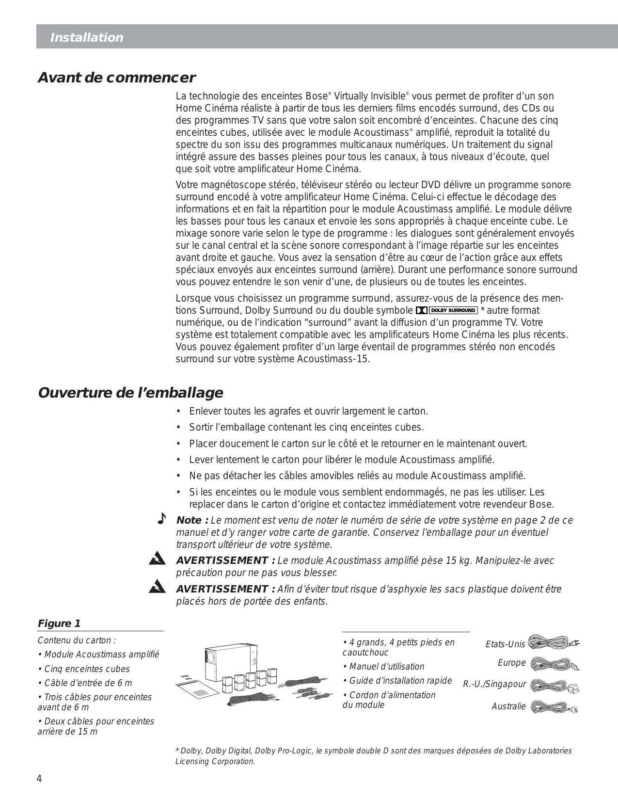 Installation Avant de commencer La technologie des enceintes Bose® Virtually Invisible® vous permet de profiter d’un son Home Cinéma réaliste à partir de tous les derniers films encodés surround, des CDs ou des programmes TV sans que votre salon soit encombré d’enceintes. Chacune des cinq enceintes cubes, utilisée avec le module Acoustimass® amplifié, reproduit la totalité du spectre du son issu des programmes multicanaux numériques. Un traitement du signal intégré assure des basses pleines pour tous les canaux, à tous niveaux d’écoute, quel que soit votre amplificateur Home Cinéma. Votre magnétoscope stéréo, téléviseur stéréo ou lecteur DVD délivre un programme sonore surround encodé à votre amplificateur Home Cinéma. Celui-ci effectue le décodage des informations et en fait la répartition pour le module Acoustimass amplifié. Le module délivre les basses pour tous les canaux et envoie les sons appropriés à chaque enceinte cube. Le mixage sonore varie selon le type de programme : les dialogues sont généralement envoyés sur le canal central et la scène sonore correspondant à l’image répartie sur les enceintes avant droite et gauche. Vous avez la sensation d’être au cœur de l’action grâce aux effets spéciaux envoyés aux enceintes surround (arrière). Durant une performance sonore surround vous pouvez entendre le son venir d’une, de plusieurs ou de toutes les enceintes. Lorsque vous choisissez un programme surround, assurez-vous de la présence des men* autre format tions Surround, Dolby Surround ou du double symbole numérique, ou de l’indication “surround” avant la diffusion d’un programme TV. Votre système est totalement compatible avec les amplificateurs Home Cinéma les plus récents. Vous pouvez également profiter d’un large éventail de programmes stéréo non encodés surround sur votre système Acoustimass-15. Ouverture de l’emballage