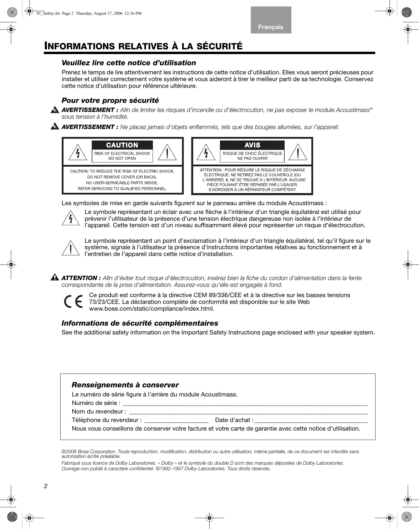 Les symboles de mise en garde suivants figurent sur le panneau arrière du module Acoustimass : Le symbole représentant un éclair avec une flèche à l’intérieur d’un triangle équilatéral est utilisé pour prévenir l’utilisateur de la présence d’une tension électrique dangereuse non isolée à l’intérieur de l’appareil. Cette tension est d’un niveau suffisamment élevé pour représenter un risque d’électrocution. Le symbole représentant un point d’exclamation à l’intérieur d’un triangle équilatéral, tel qu’il figure sur le système, signale à l’utilisateur la présence d’instructions importantes relatives au fonctionnement et à l’entretien de l’appareil dans cette notice d’installation. ATTENTION : Afin d’éviter tout risque d’électrocution, insérez bien la fiche du cordon d’alimentation dans la fente correspondante de la prise d’alimentation. Assurez-vous qu’elle est engagée à fond. Ce produit est conforme à la directive CEM 89/336/CEE et à la directive sur les basses tensions 73/23/CEE. La déclaration complète de conformité est disponible sur le site Web www.bose.com/static/compliance/index.html. Informations de sécurité complémentaires See the additional safety information on the Important Safety Instructions page enclosed with your speaker system. Renseignements à conserver Le numéro de série figure à l’arrière du module Acoustimass. Numéro de série : ________________________________________________________________________________ Nom du revendeur : ______________________________________________________________________________ Téléphone du revendeur : _____________________ Date d’achat : _____________________________________ Nous vous conseillons de conserver votre facture et votre carte de garantie avec cette notice d’utilisation. ©2006 Bose Corporation. Toute reproduction, modification, distribution ou autre utilisation, même partielle, de ce document est interdite sans autorisation écrite préalable. Fabriqué sous licence de Dolby Laboratories. « Dolby » et le symbole du double D sont des marques déposées de Dolby Laboratories. Ouvrage non publié à caractère confidentiel. ©1992-1997 Dolby Laboratories. Tous droits réservés.