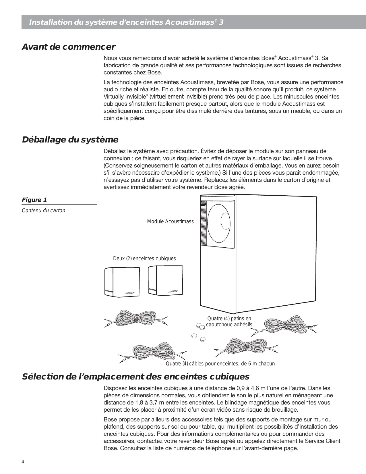 L'installation et l'utilisation de vos enceintes Acoustimass 3 différent considérablement de celles d'autres enceintes. Prenez le temps de dire soigneusement cette notice d'utilisation. Elle vous aidera à installerer et à faire fonctionnerVote système de maniere appropriée et à en approucem pleinement les fonctionnalités avancées. N'oubliez pas de conserver cette notice afin de pouvoir vous y reporter ultérieurement.