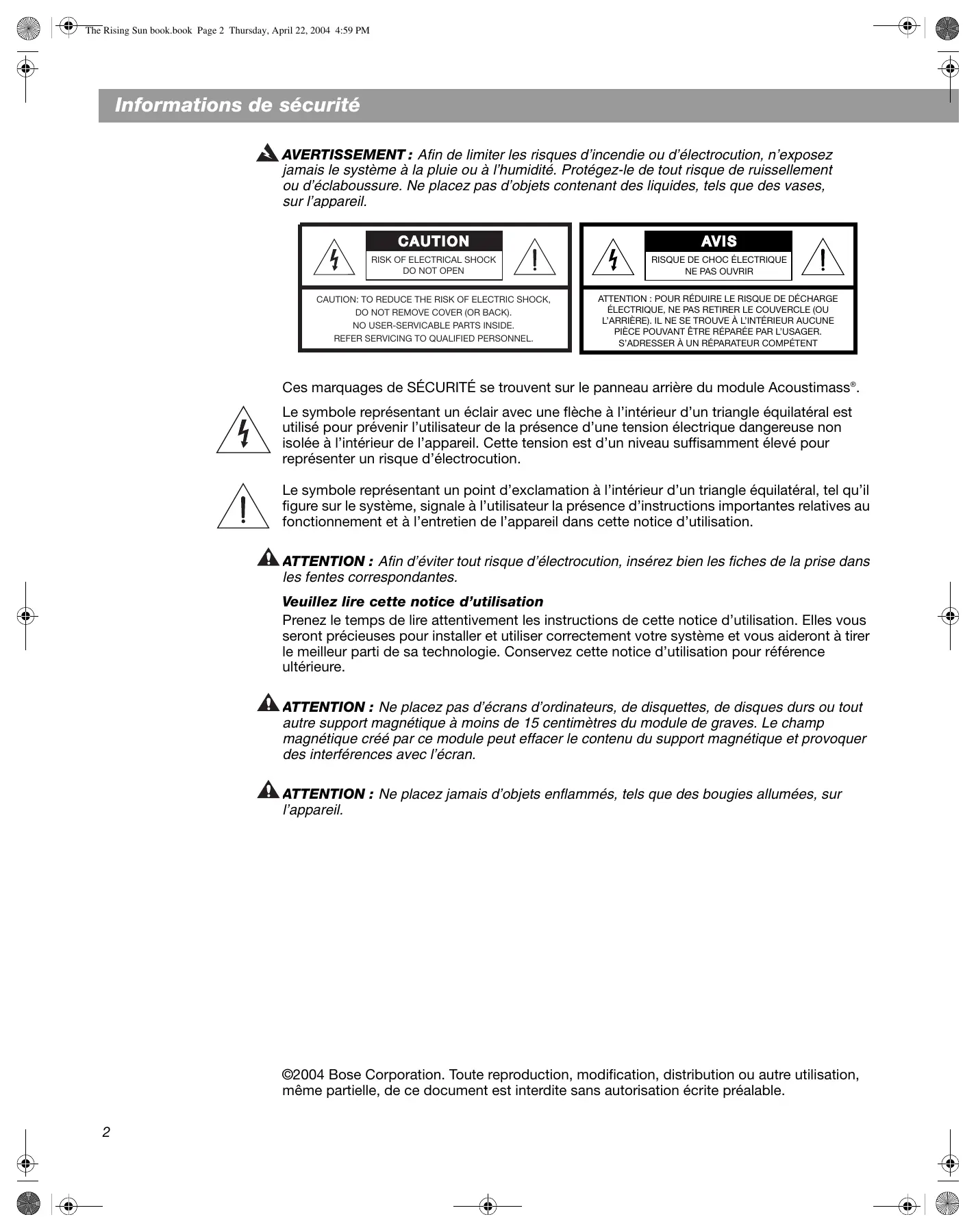 CAUTION: TO REDUCE THE RISK OF ELECTRIC SHOCK, DO NOT REMOVE COVER (OR BACK). NO USER-SERVICABLE PARTS INSIDE. REFER SERVICING TO QUALIFIED PERSONNEL. ATTENTION : POUR RÉDUIRE LE RISQUE DE DÉCHARGE ÉLECTRIQUE, NE PAS RETIRER LE COUVERCLE (OU L’ARRIÈRE). IL NE SE TROUVE À L’INTÉRIEUR AUCUNE PIÈCE POUVANT ÊTRE RÉPARÉE PAR L’USAGER. S’ADRESSER À UN RÉPARATEUR COMPÉTENT Ces marquages de SÉCURITÉ se trouvent sur le panneau arrière du module Acoustimass®. Français Le symbole représentant un éclair avec une flèche à l’intérieur d’un triangle équilatéral est utilisé pour prévenir l’utilisateur de la présence d’une tension électrique dangereuse non isolée à l’intérieur de l’appareil. Cette tension est d’un niveau suffisamment élevé pour représenter un risque d’électrocution. Le symbole représentant un point d’exclamation à l’intérieur d’un triangle équilatéral, tel qu’il figure sur le système, signale à l’utilisateur la présence d’instructions importantes relatives au fonctionnement et à l’entretien de l’appareil dans cette notice d’utilisation. ATTENTION : Afin d’éviter tout risque d’électrocution, insérez bien les fiches de la prise dans les fentes correspondantes. Veuillez lire cette notice d’utilisation Prenez le temps de lire attentivement les instructions de cette notice d’utilisation. Elles vous seront précieuses pour installer et utiliser correctement votre système et vous aideront à tirer le meilleur parti de sa technologie. Conservez cette notice d’utilisation pour référence ultérieure. ATTENTION : Ne placez pas d’écrans d’ordinateurs, de disquettes, de disques durs ou tout autre support magnétique à moins de 15 centimètres du module de graves. Le champ magnétique créé par ce module peut effacer le contenu du support magnétique et provoquer des interférences avec l’écran. ATTENTION : Ne placez jamais d’objets enflammés, tels que des bougies allumées, sur l’appareil. ©2004 Bose Corporation. Toute reproduction, modification, distribution ou autre utilisation, même partielle, de ce document est interdite sans autorisation écrite préalable.