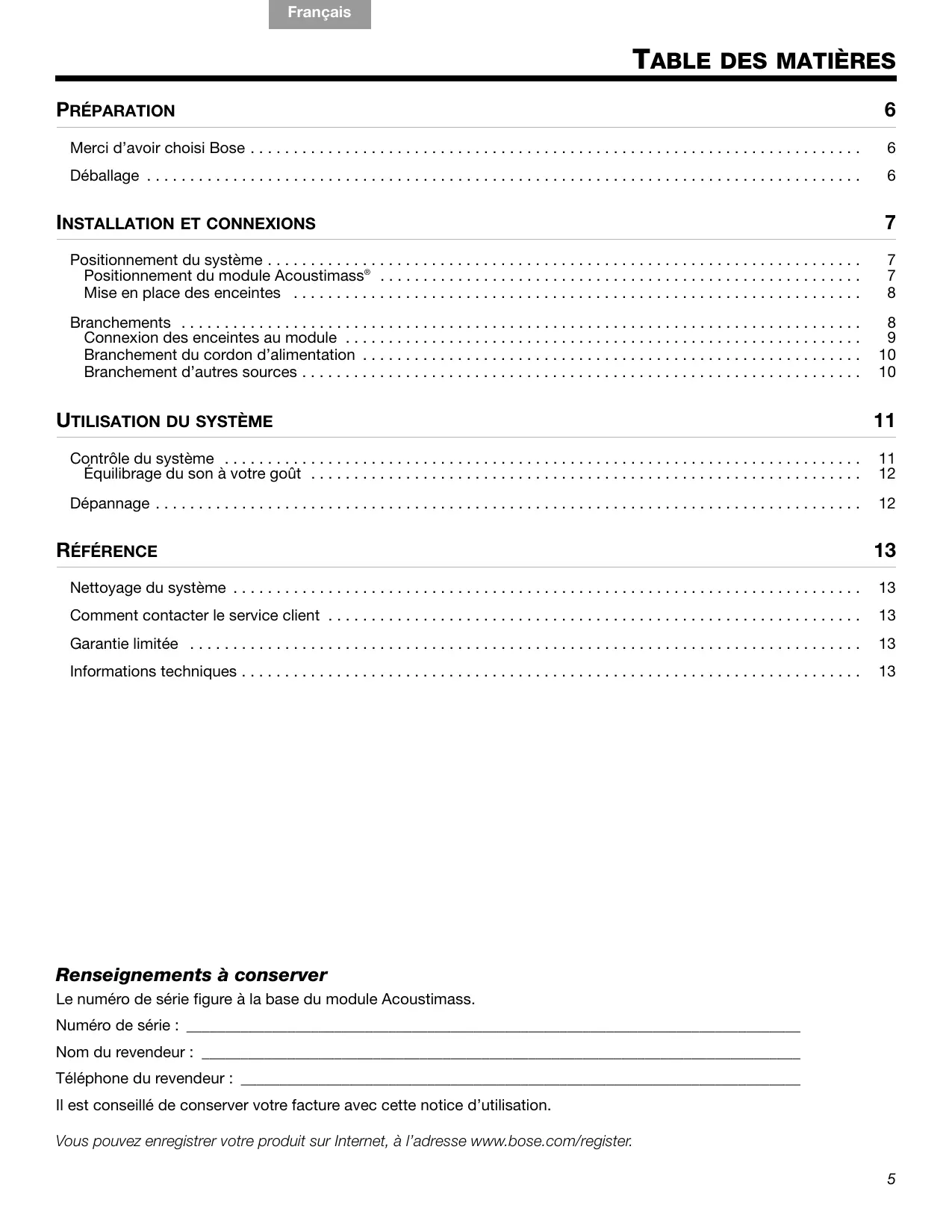 Renseignements à conserver Le numéro de série figure à la base du module Acoustimass. Numéro de série : _______________________________________________________________________________ Nom du revendeur : _____________________________________________________________________________ Téléphone du revendeur : ________________________________________________________________________ Il est conseillé de conserver votre facture avec cette notice d’utilisation. Vous pouvez enregistrer votre produit sur Internet, à l’adresse www.bose.com/register.
