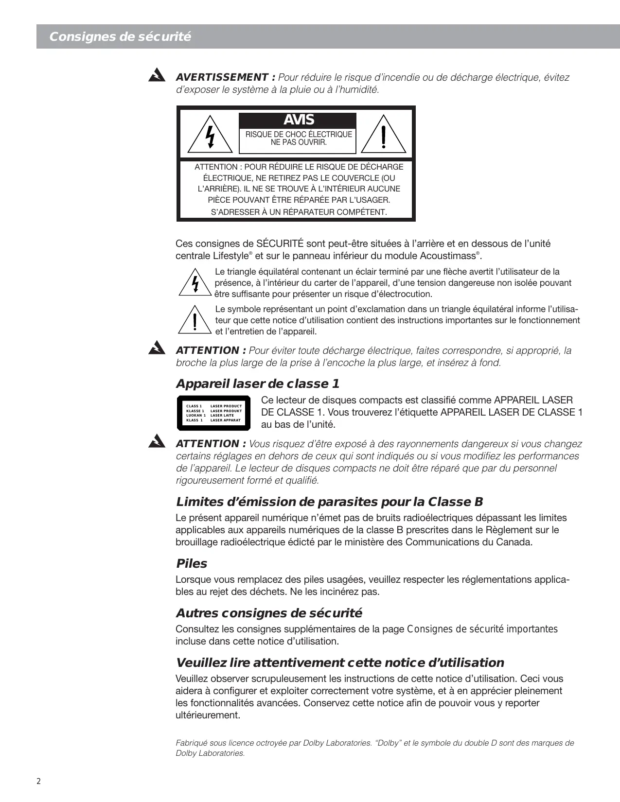 Ces consignes de SÉCURITÉ sont peut-être situées à l’arrière et en dessous de l’unité centrale Lifestyle® et sur le panneau inférieur du module Acoustimass®. Le triangle équilatéral contenant un éclair terminé par une flèche avertit l’utilisateur de la présence, à l’intérieur du carter de l’appareil, d’une tension dangereuse non isolée pouvant être suffisante pour présenter un risque d’électrocution. Le symbole représentant un point d’exclamation dans un triangle équilatéral informe l’utilisateur que cette notice d’utilisation contient des instructions importantes sur le fonctionnement et l’entretien de l’appareil.