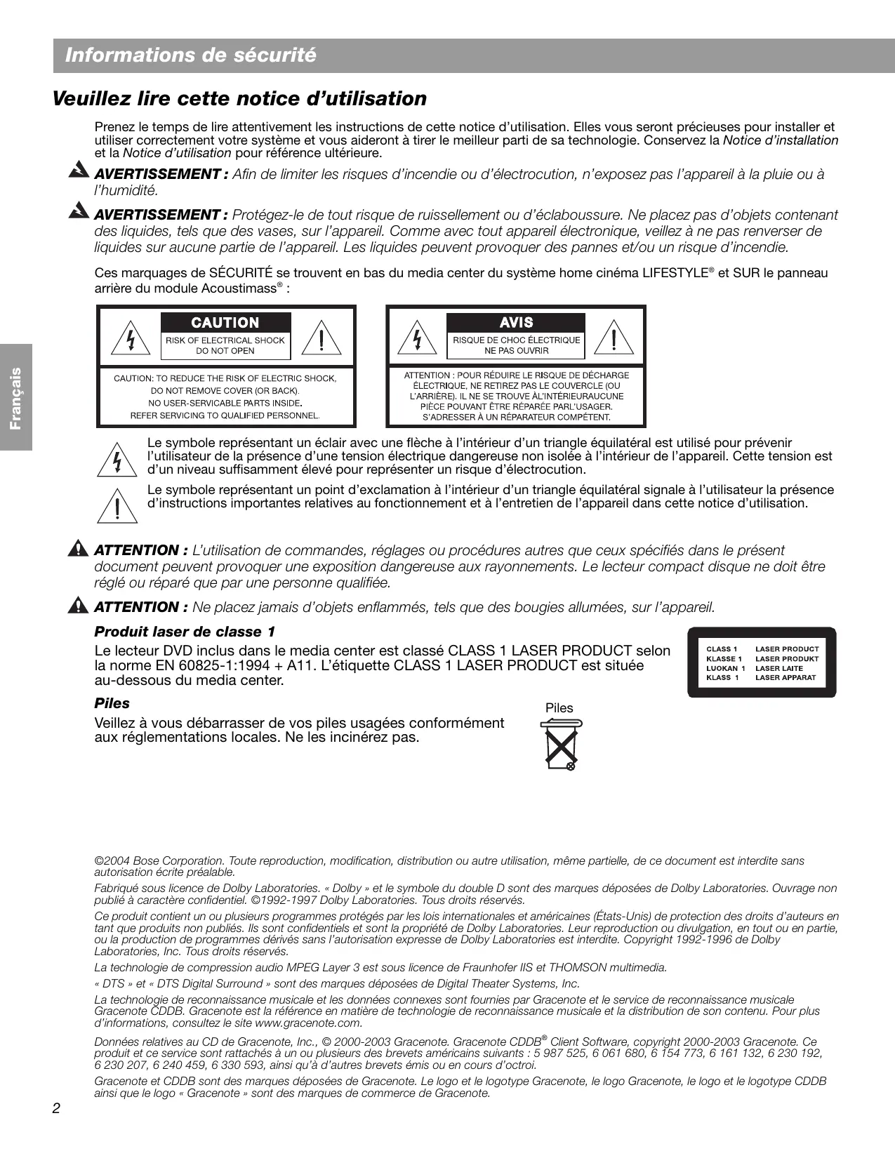 Les consommateurs doivent avoir conscience du fait que les téléviseurs haute définition ne sont pas tous entièrement compatibles avec ce produit, ce qui peut provoquer l’affichage de parasites dans l’image. Pour les problèmes d’image à balayage progressif 525, il est recommandé de basculer vers une connexion de type vidéo composante. Pour les questions relatives à la compatibilité des téléviseurs avec ce modèle de lecteur DVD 525p, veuillez contacter notre service clientèle. Ce produit intègre une technologie de défense des droits d’auteurs et d’autres droits de propriété intellectuelle détenus par Cirrus Logic, Inc. Il est soumis aux lois de protection des droits d’auteurs des Etats-Unis ainsi qu’à d’autres restrictions et protections d’octroi de licence. L’utilisation de ladite technologie se limite uniquement à l’utilisation des circuits intégrés Cirrus Logic intégrés à ce produit. Tout désassemblage ou démontage est interdit. Conçu avec la technologie UEI™ sous licence de Universal Electronics Inc. © UEI 2000-2002. Avis légal : AEC One Stop Group, Inc. (désigné sous l’appellation « AEC ») détient l’exclusivité des droits des bases de données ALL MUSIC GUIDE et ALL MOVIE GUIDE (désigné sous l’appellation « Guides »). Vous ne devez pas modifier, copier, scanner ou utiliser toute autre méthode en vue de reproduire, dupliquer, convertir, rééditer, transmettre ou distribuer tout ou partie de ces Guides. Vous ne devez pas télécharger ces Guides. Toute utilisation est soumise à toutes les restrictions applicables mentionnées dans le présent document. Vous acceptez d’indemniser, de défendre et de tenir à couvert AEC et ses filiales, ainsi que Bose et ses filiales, contre toutes réclamations, dommages, coûts ou autres frais susceptibles de survenir directement ou indirectement (i) suite à une utilisation non autorisée de ces Guides, (ii) en violation de cette directive et/ou (iii) suite à toute activité non autorisée concernant ces Guides.
