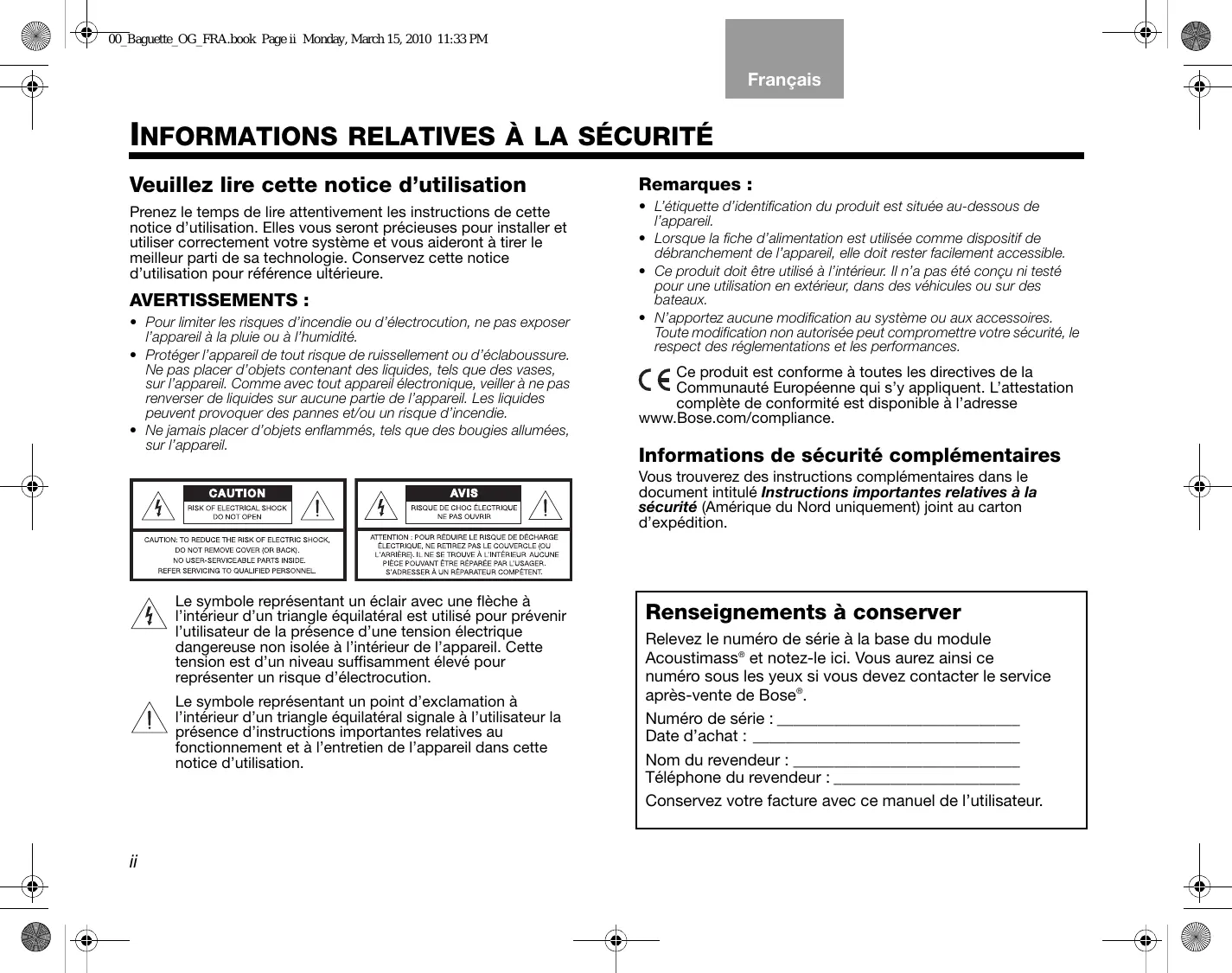 Renseignements à conserver Relevez le numéro de série à la base du module Acoustimass® et notez-le ici. Vous aurez ainsi ce numéro sous les yeux si vous devez contacter le service après-vente de Bose®. Numéro de série : ______________________________ Date d’achat : _________________________________ Nom du revendeur : ____________________________ Téléphone du revendeur : _______________________ Conservez votre facture avec ce manuel de l’utilisateur. 00_Baguette_OG_FRA.book Page iii Monday, March 15, 2010 11:33 PM English Español Français